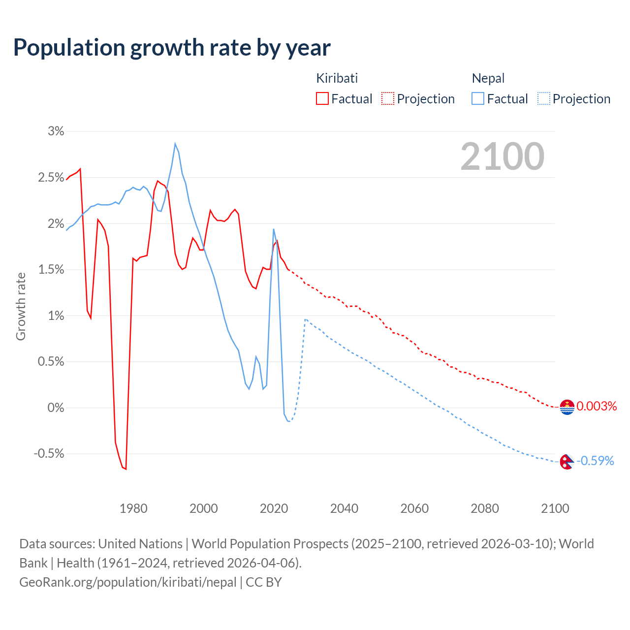 - For the last 10 years, Kiribati has had an average growth rate of +1.53% per year vs +0.66% in Nepal.