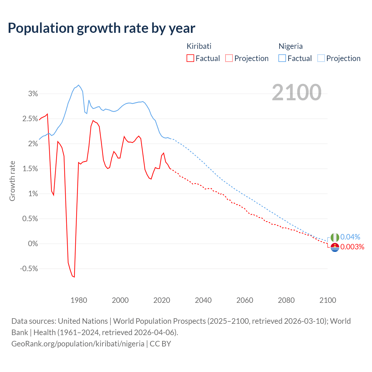 - For the last 10 years, Kiribati has had an average growth rate of +1.53% per year vs +2.31% in Nigeria.
