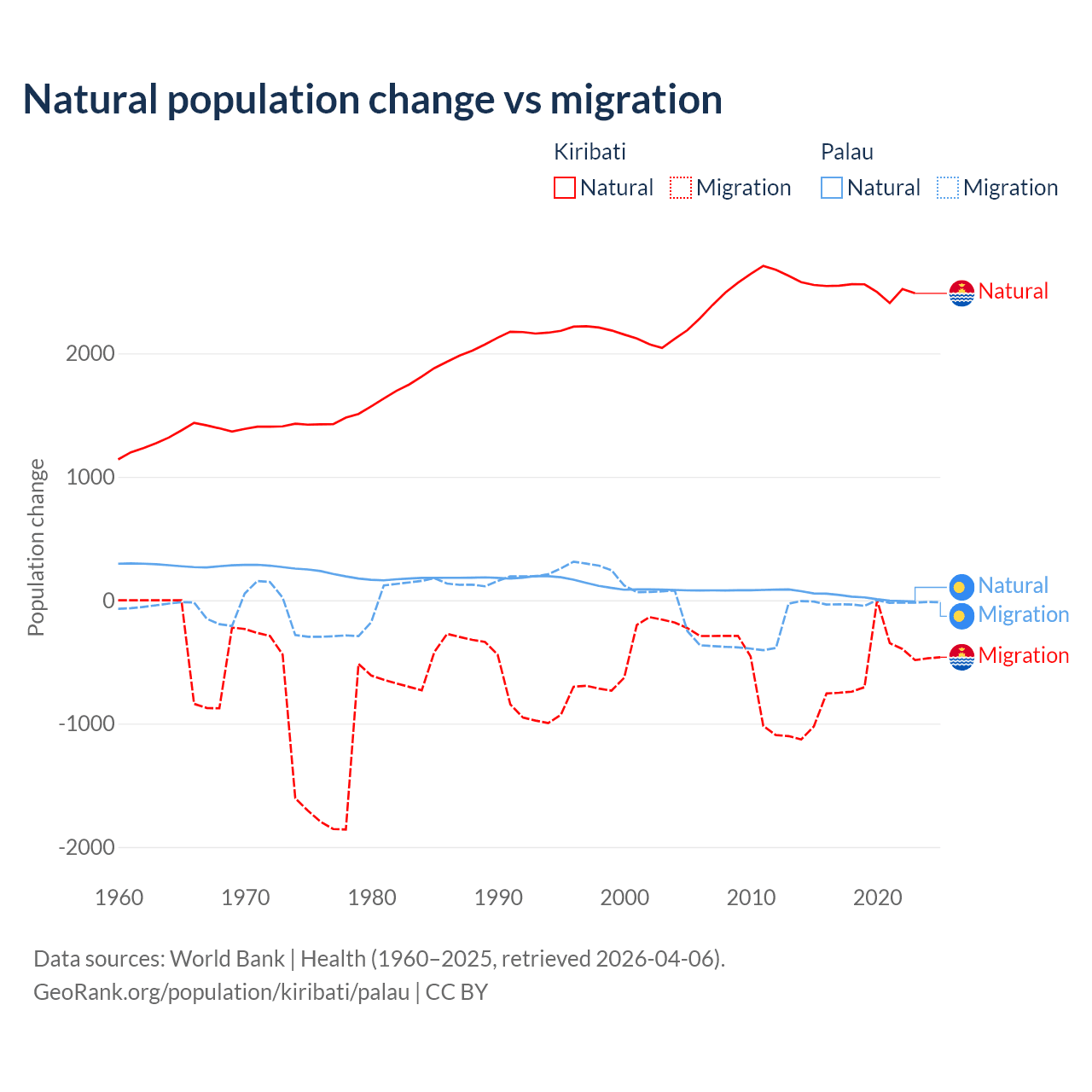 Over the last 10 years, 80% of the population change in Kiribati is from natural causes (a gain of 25,262 people) and 20% is from migration (a loss of 6,330 people). In Palau 53.8% is from natural causes (a gain of 264 people) and 46.2% is from migration (a loss of 227 people).