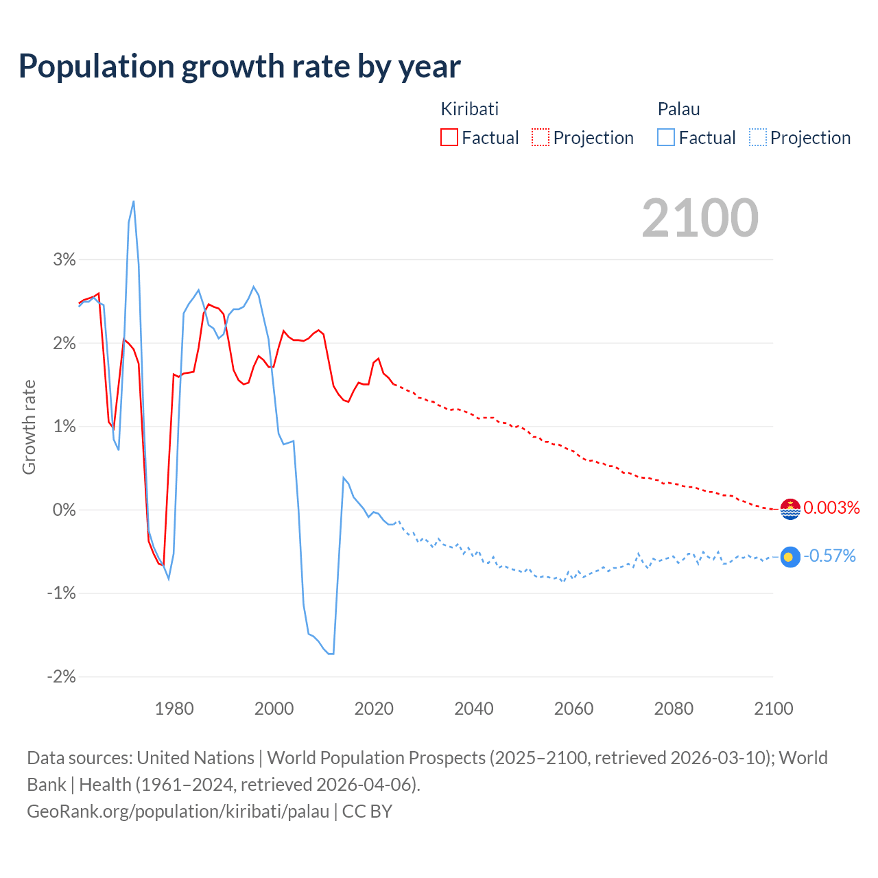 - For the last 10 years, Kiribati has had an average growth rate of +1.53% per year vs +0.02% in Palau.