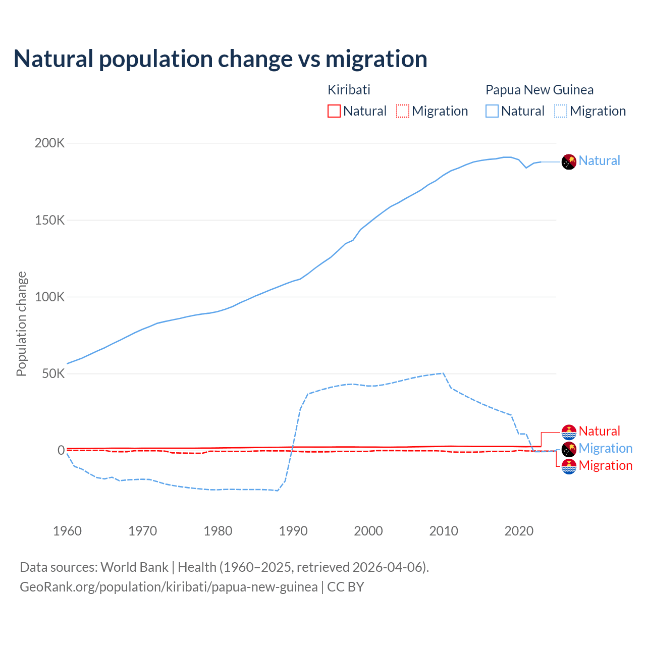 Over the last 10 years, 80% of the population change in Kiribati is from natural causes (a gain of 25,262 people) and 20% is from migration (a loss of 6,330 people). In Papua New Guinea 91% is from natural causes (a gain of 1,883,906 people) and 8.98% is from migration (a gain of 185,900 people).