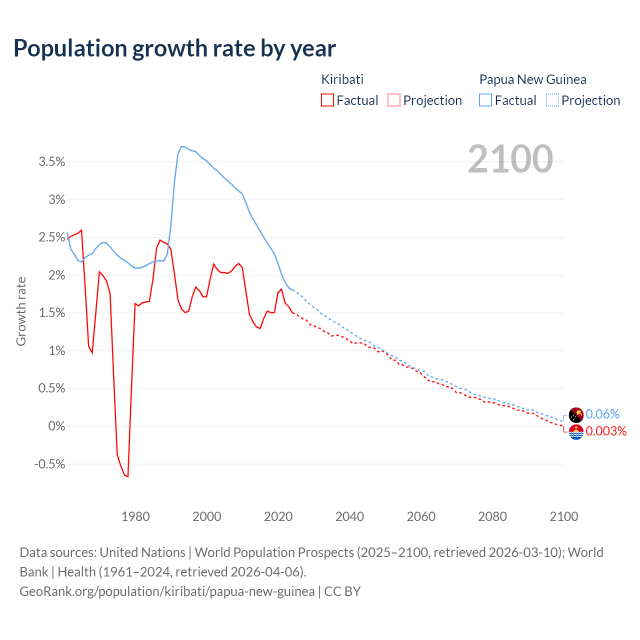 - For the last 10 years, Kiribati has had an average growth rate of +1.53% per year vs +2.23% in Papua New Guinea.