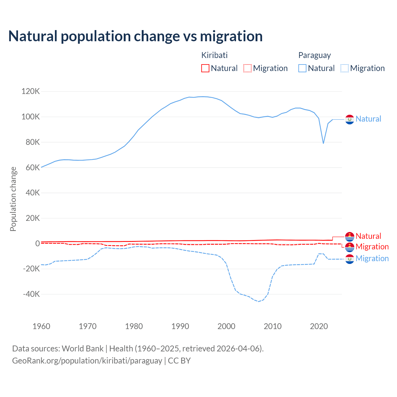 Over the last 10 years, 80% of the population change in Kiribati is from natural causes (a gain of 25,262 people) and 20% is from migration (a loss of 6,330 people). In Paraguay 87.6% is from natural causes (a gain of 1,002,636 people) and 12.4% is from migration (a loss of 141,377 people).