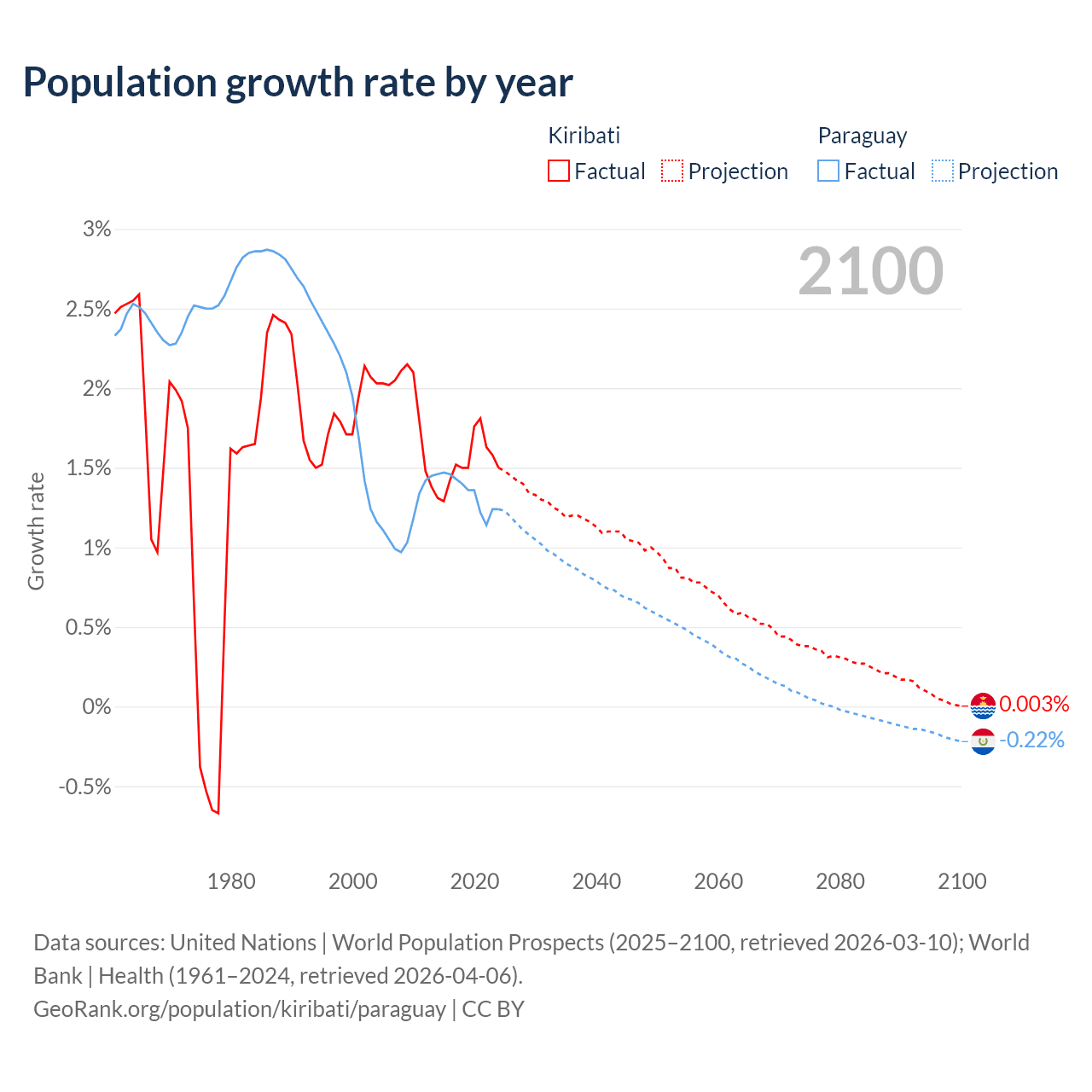 - For the last 10 years, Kiribati has had an average growth rate of +1.53% per year vs +1.34% in Paraguay.
