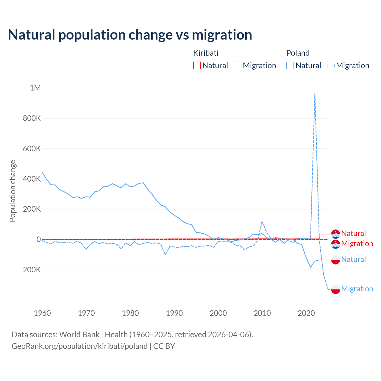 Over the last 10 years, 80% of the population change in Kiribati is from natural causes (a gain of 25,262 people) and 20% is from migration (a loss of 6,330 people). In Poland 41.4% is from natural causes (a loss of 675,443 people) and 58.6% is from migration (a gain of 955,766 people).