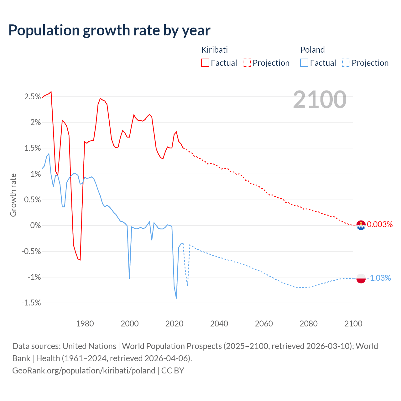 - For the last 10 years, Kiribati has had an average growth rate of +1.53% per year vs -0.36% in Poland.