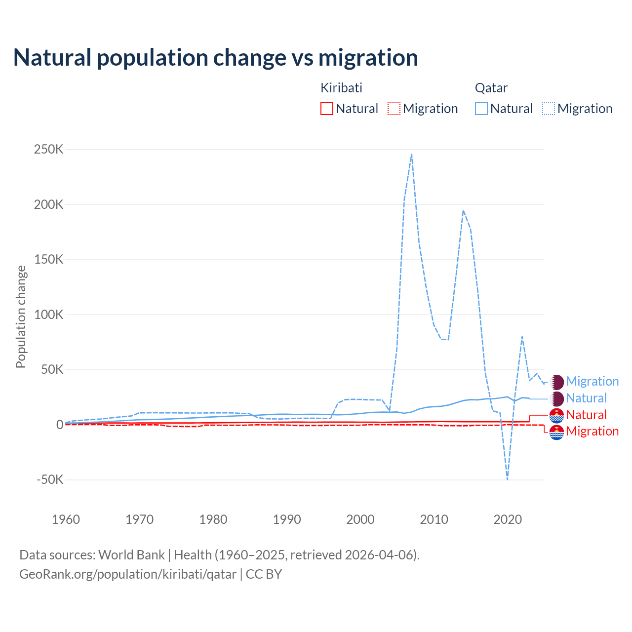 Over the last 10 years, 80% of the population change in Kiribati is from natural causes (a gain of 25,262 people) and 20% is from migration (a loss of 6,330 people). In Qatar 26.1% is from natural causes (a gain of 232,009 people) and 73.9% is from migration (a gain of 655,712 people).