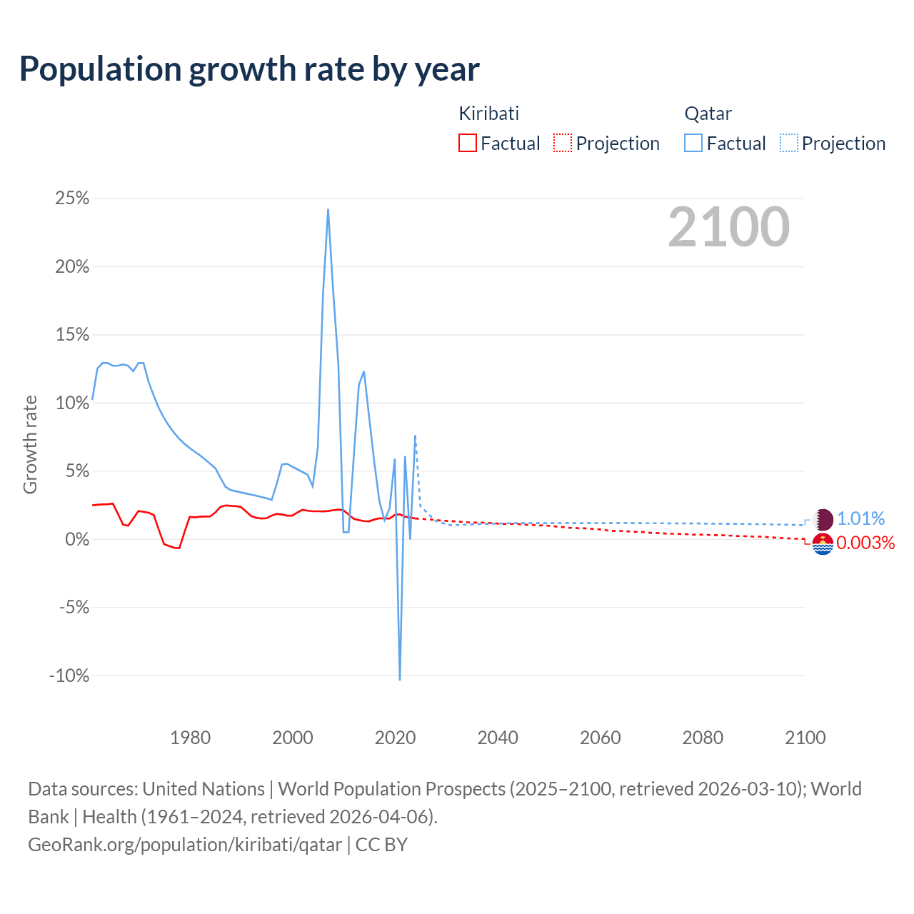 - For the last 10 years, Kiribati has had an average growth rate of +1.53% per year vs +3.86% in Qatar.