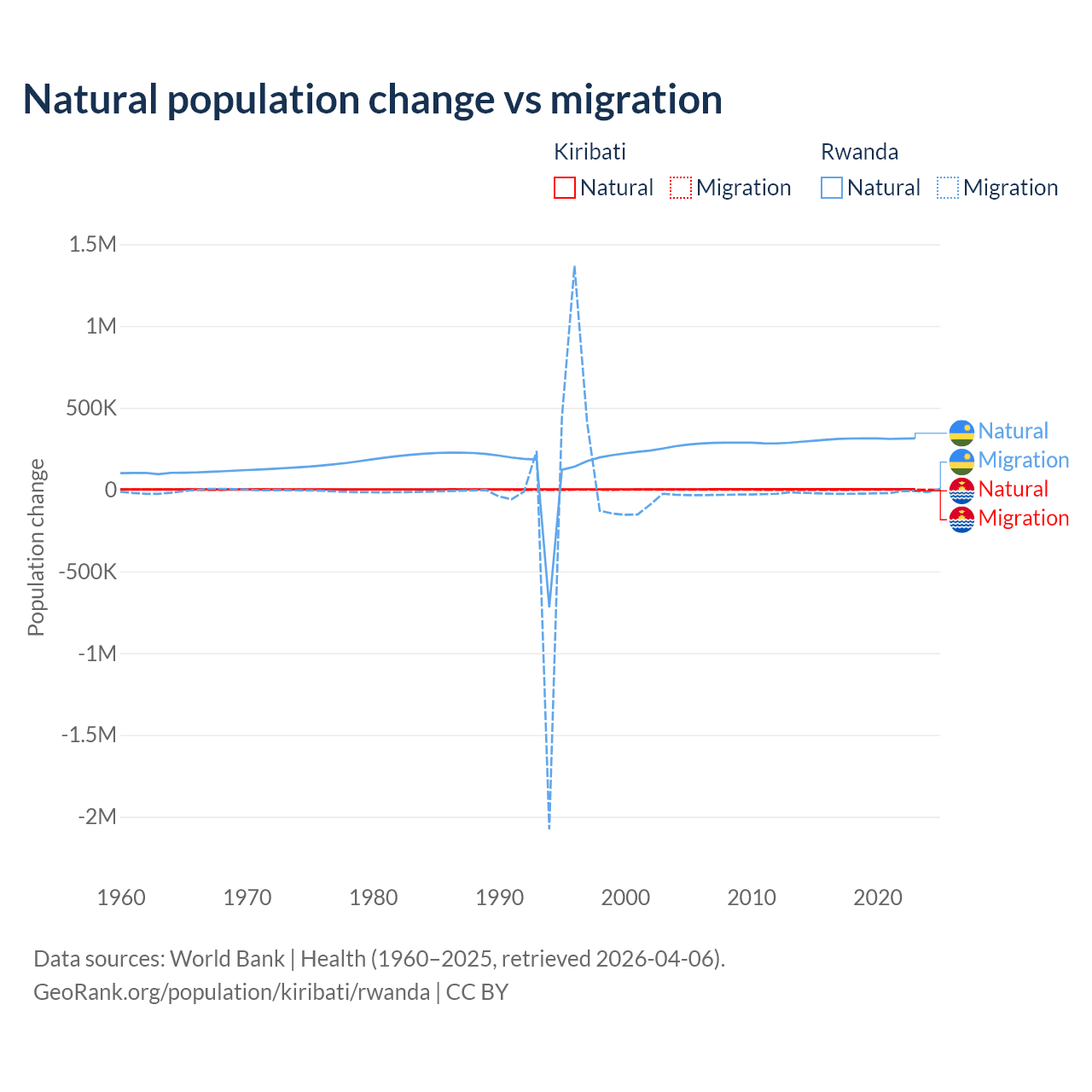 Over the last 10 years, 80% of the population change in Kiribati is from natural causes (a gain of 25,262 people) and 20% is from migration (a loss of 6,330 people). In Rwanda 93.8% is from natural causes (a gain of 3,081,296 people) and 6.18% is from migration (a loss of 203,035 people).