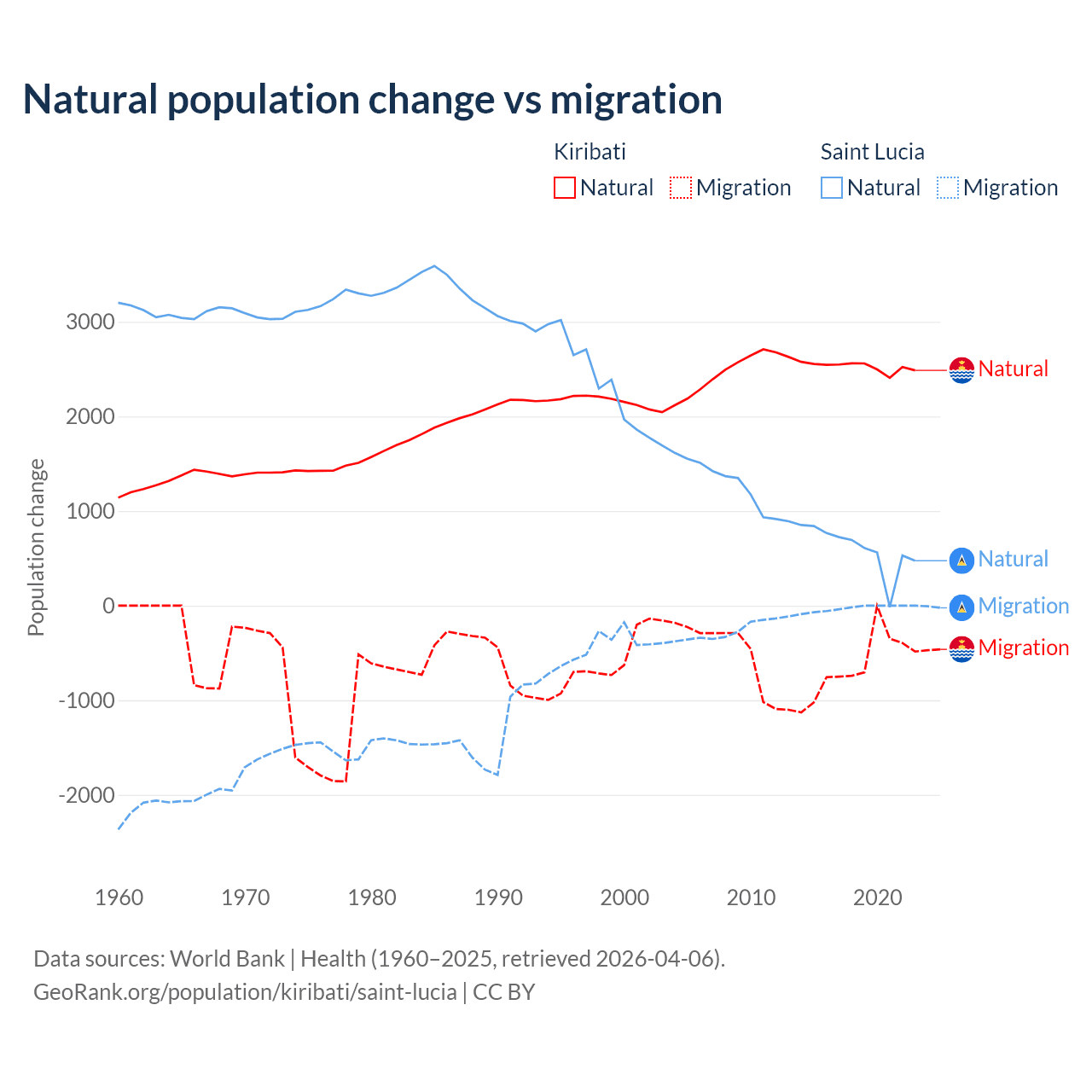 Over the last 10 years, 80% of the population change in Kiribati is from natural causes (a gain of 25,262 people) and 20% is from migration (a loss of 6,330 people). In Saint Lucia 95.7% is from natural causes (a gain of 6,039 people) and 4.31% is from migration (a loss of 272 people).