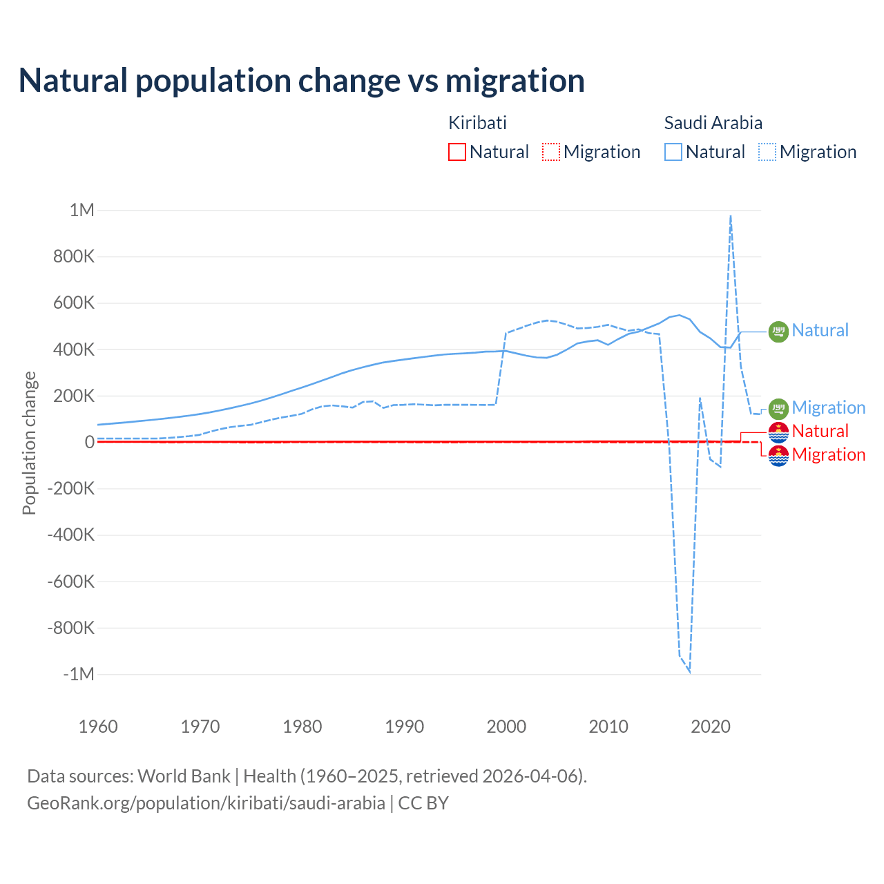 Over the last 10 years, 80% of the population change in Kiribati is from natural causes (a gain of 25,262 people) and 20% is from migration (a loss of 6,330 people). In Saudi Arabia 93.9% is from natural causes (a gain of 4,829,562 people) and 6.05% is from migration (a gain of 311,209 people).