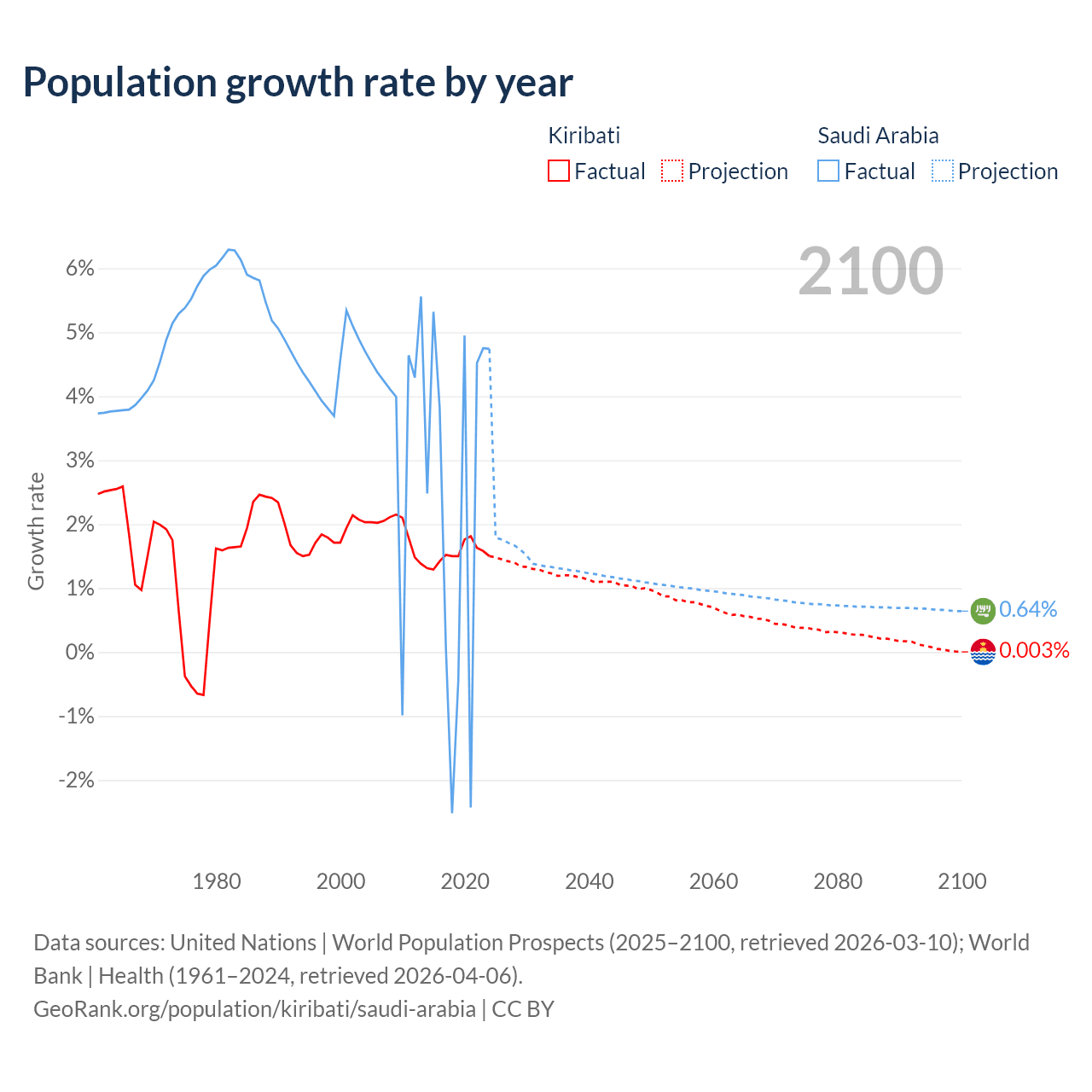 - For the last 10 years, Kiribati has had an average growth rate of +1.53% per year vs +2.3% in Saudi Arabia.