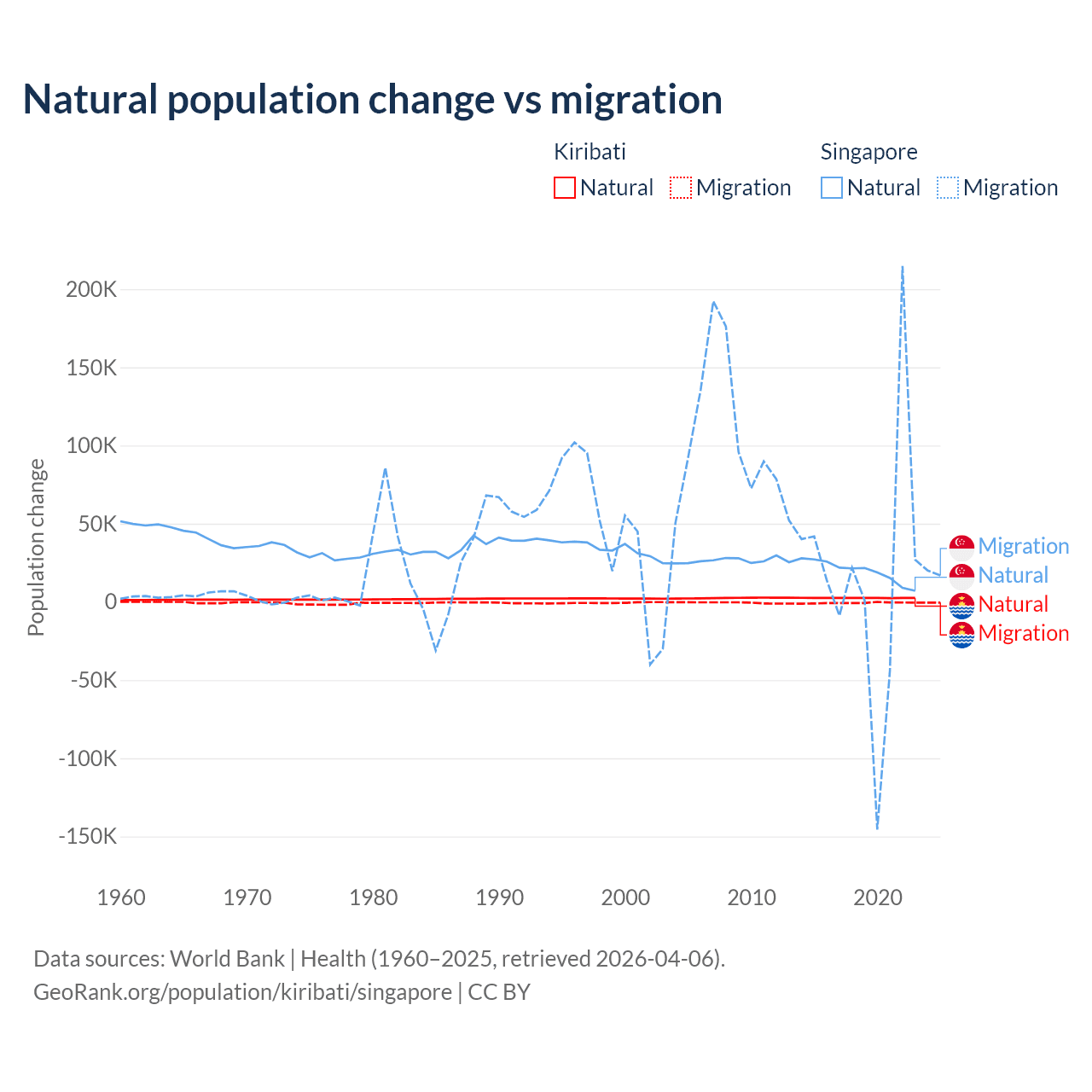 Over the last 10 years, 80% of the population change in Kiribati is from natural causes (a gain of 25,262 people) and 20% is from migration (a loss of 6,330 people). In Singapore 54.8% is from natural causes (a gain of 195,953 people) and 45.2% is from migration (a gain of 161,805 people).