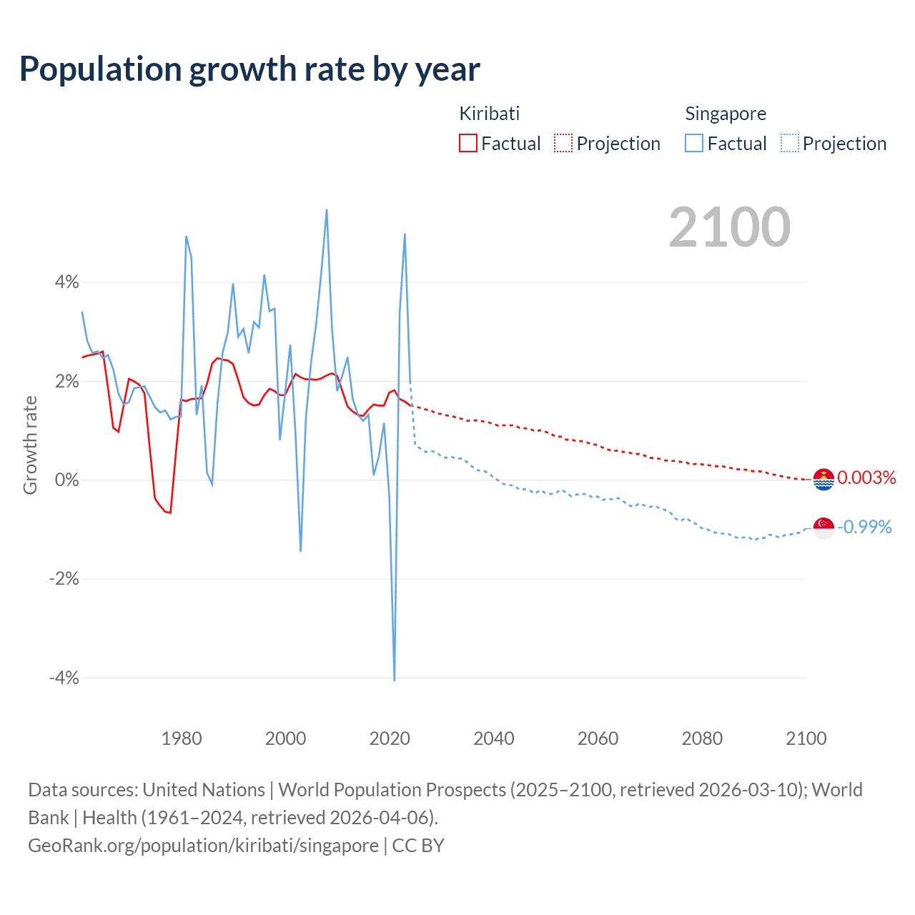 - For the last 10 years, Kiribati has had an average growth rate of +1.53% per year vs +1.04% in Singapore.