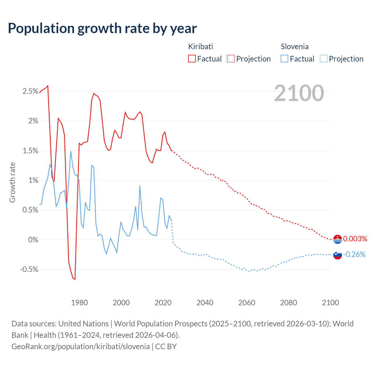 - For the last 10 years, Kiribati has had an average growth rate of +1.53% per year vs +0.29% in Slovenia.