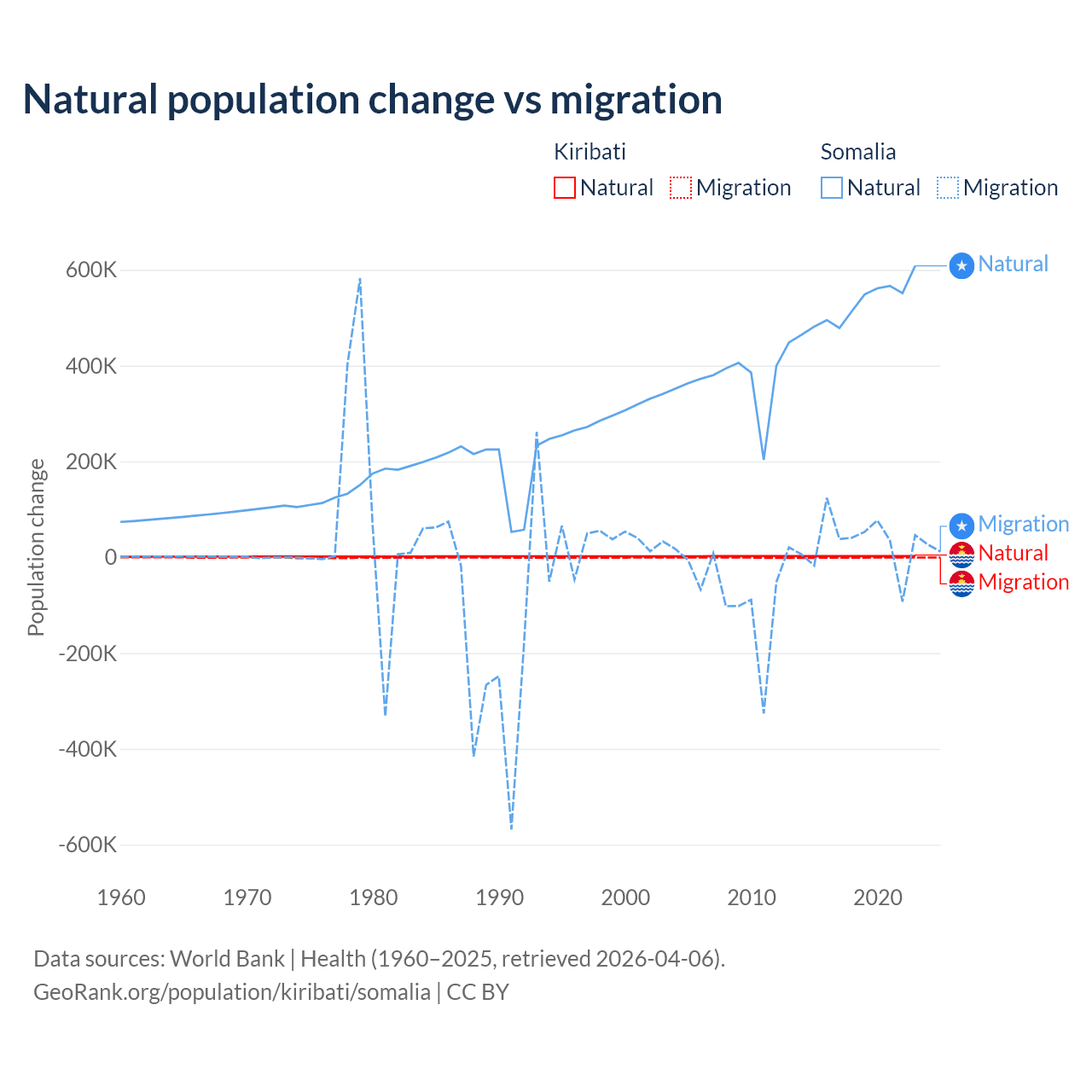 Over the last 10 years, 80% of the population change in Kiribati is from natural causes (a gain of 25,262 people) and 20% is from migration (a loss of 6,330 people). In Somalia 94.4% is from natural causes (a gain of 5,270,105 people) and 5.58% is from migration (a gain of 311,487 people).