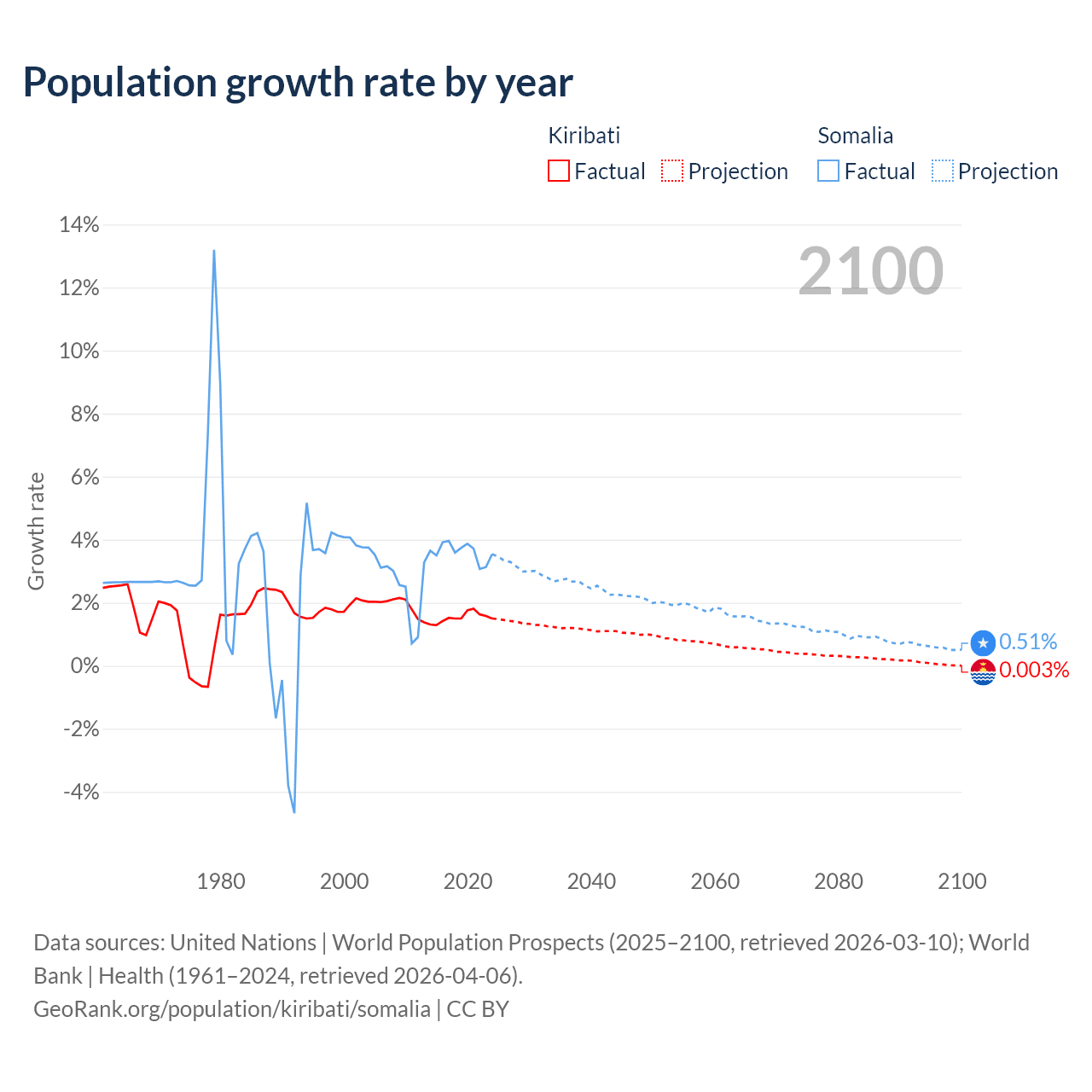 - For the last 10 years, Kiribati has had an average growth rate of +1.53% per year vs +3.61% in Somalia.