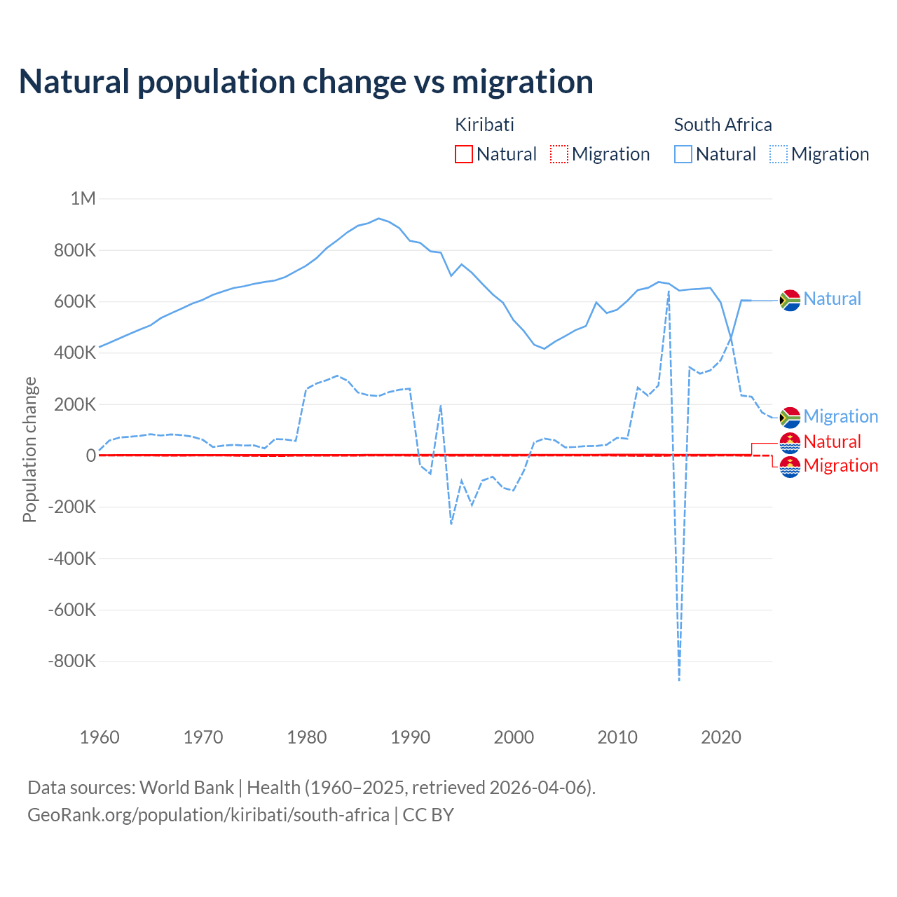 Over the last 10 years, 80% of the population change in Kiribati is from natural causes (a gain of 25,262 people) and 20% is from migration (a loss of 6,330 people). In South Africa 72.8% is from natural causes (a gain of 6,190,027 people) and 27.2% is from migration (a gain of 2,316,795 people).