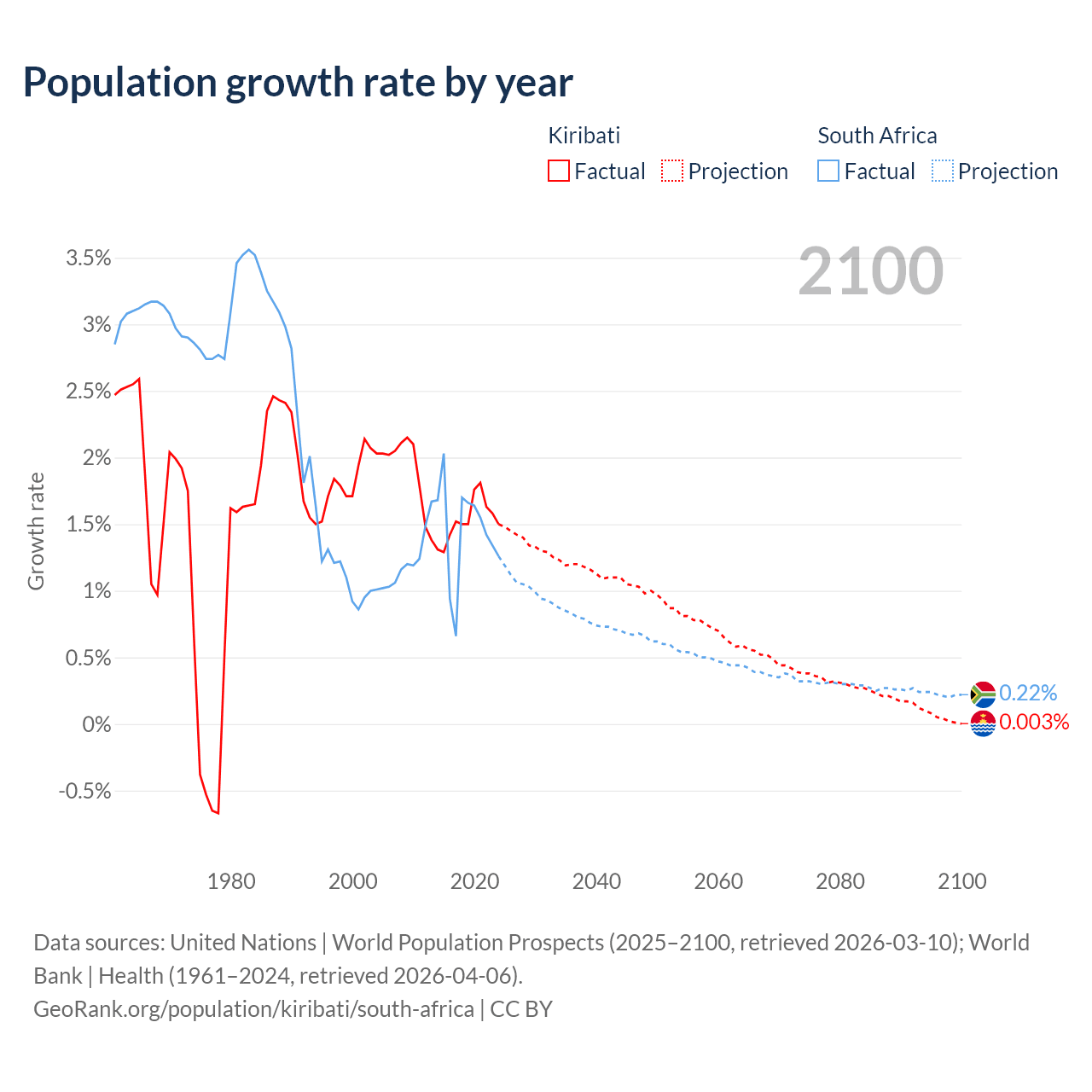 - For the last 10 years, Kiribati has had an average growth rate of +1.53% per year vs +1.44% in South Africa.