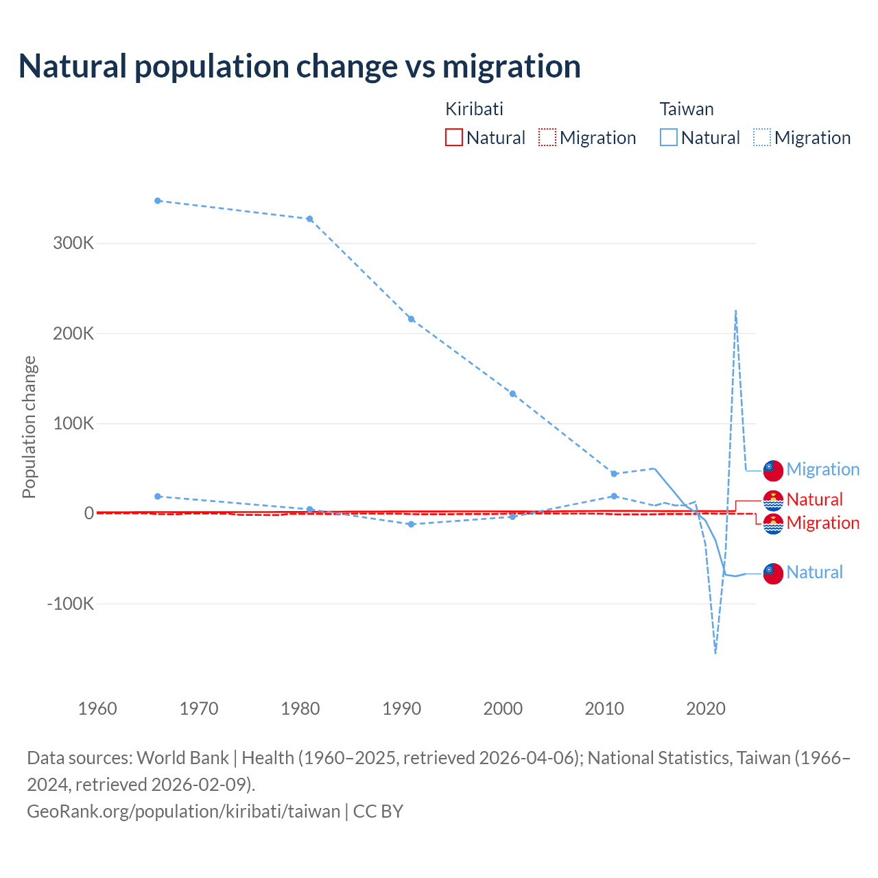 Over the last 10 years, 80% of the population change in Kiribati is from natural causes (a gain of 25,262 people) and 20% is from migration (a loss of 6,330 people). In Taiwan 56.7% is from natural causes (a loss of 57,467 people) and 43.3% is from migration (a gain of 43,884 people).