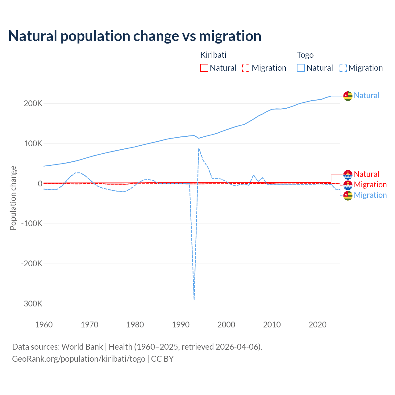 Over the last 10 years, 80% of the population change in Kiribati is from natural causes (a gain of 25,262 people) and 20% is from migration (a loss of 6,330 people). In Togo 99.1% is from natural causes (a gain of 2,052,115 people) and 0.86% is from migration (a loss of 17,852 people).