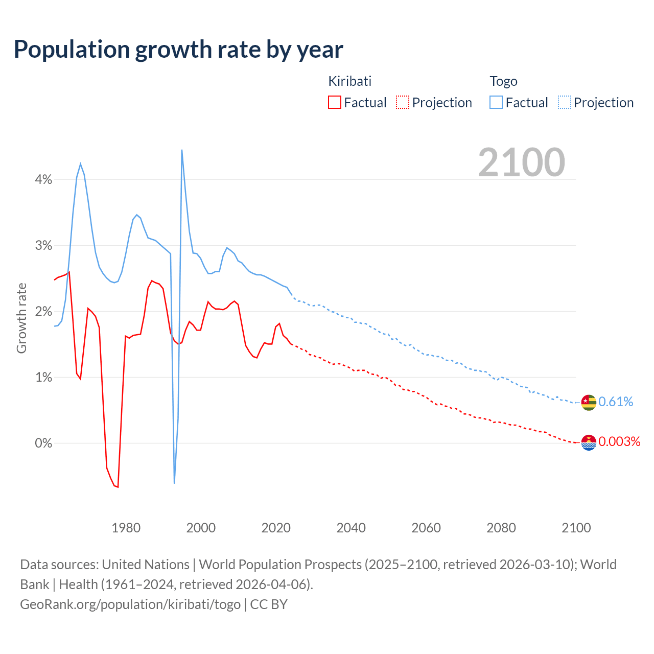 - For the last 10 years, Kiribati has had an average growth rate of +1.53% per year vs +2.46% in Togo.