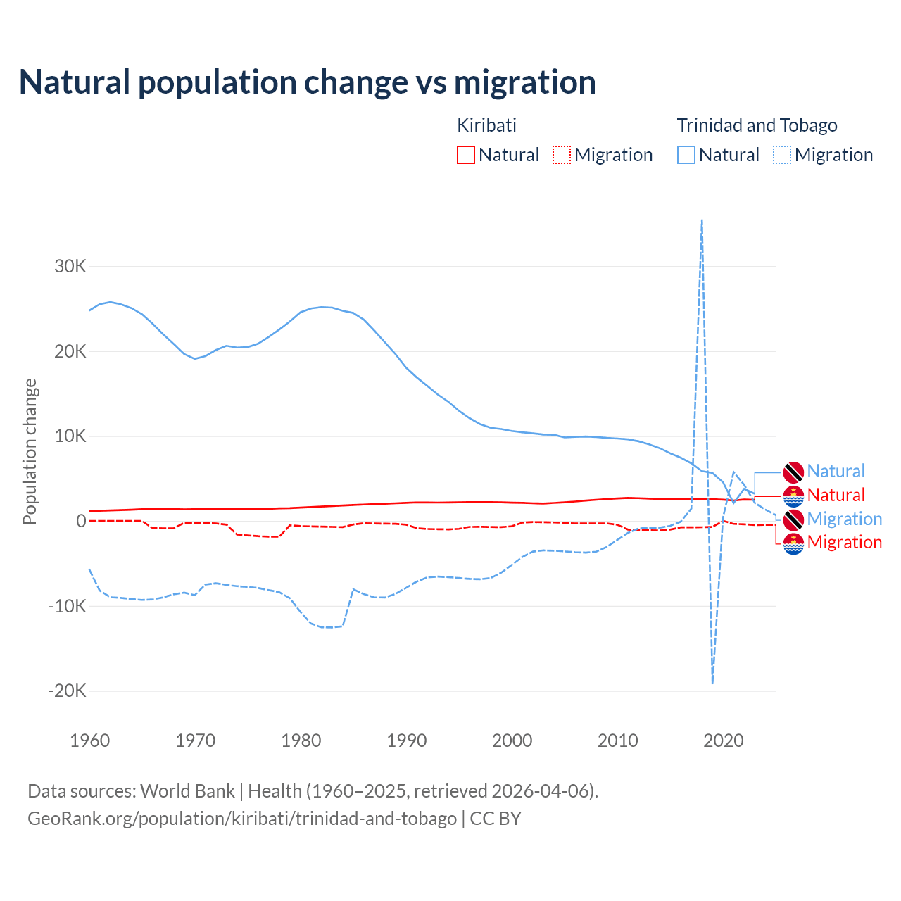 Over the last 10 years, 80% of the population change in Kiribati is from natural causes (a gain of 25,262 people) and 20% is from migration (a loss of 6,330 people). In Trinidad and Tobago 66% is from natural causes (a gain of 55,887 people) and 34% is from migration (a gain of 28,785 people).