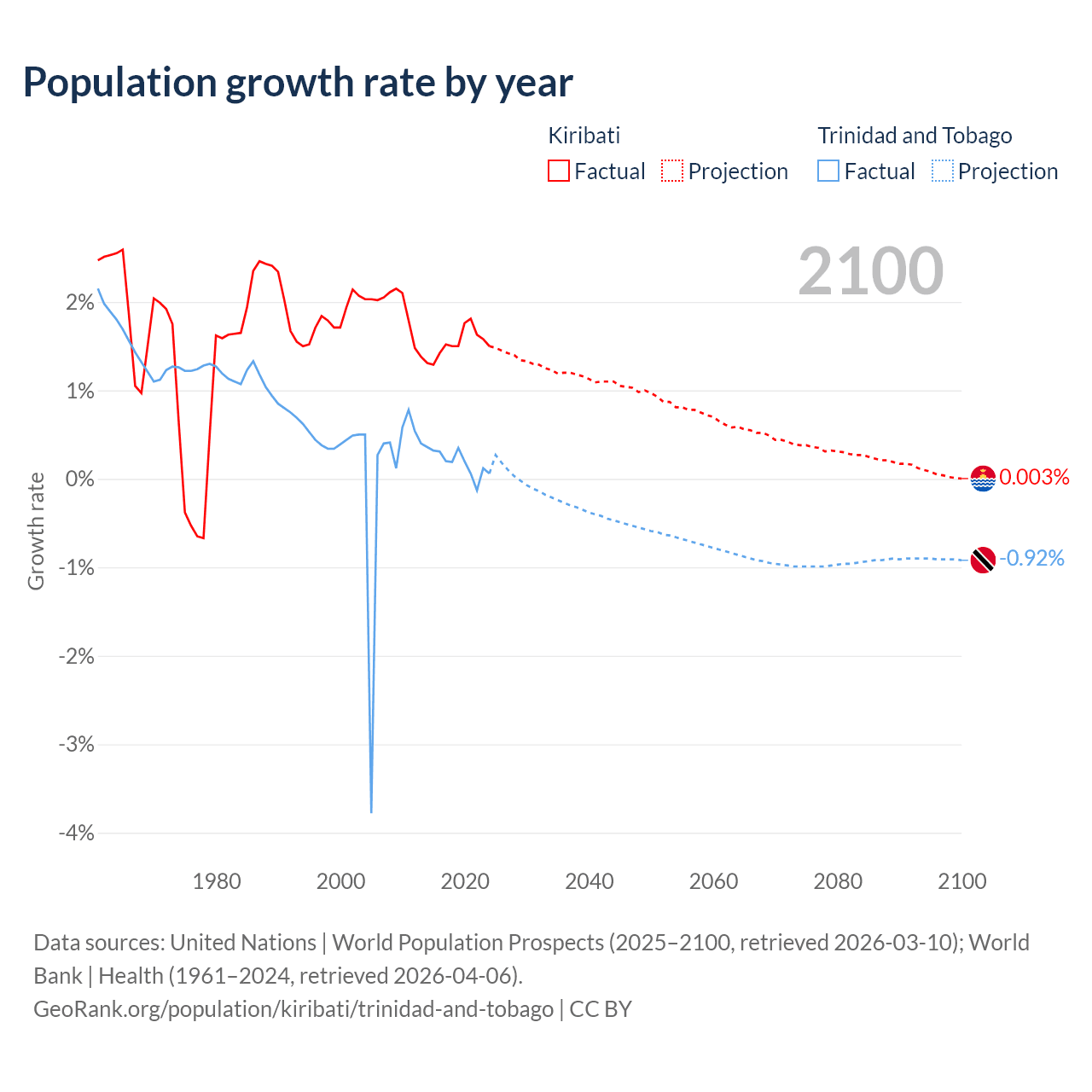 - For the last 10 years, Kiribati has had an average growth rate of +1.53% per year vs +0.19% in Trinidad and Tobago.