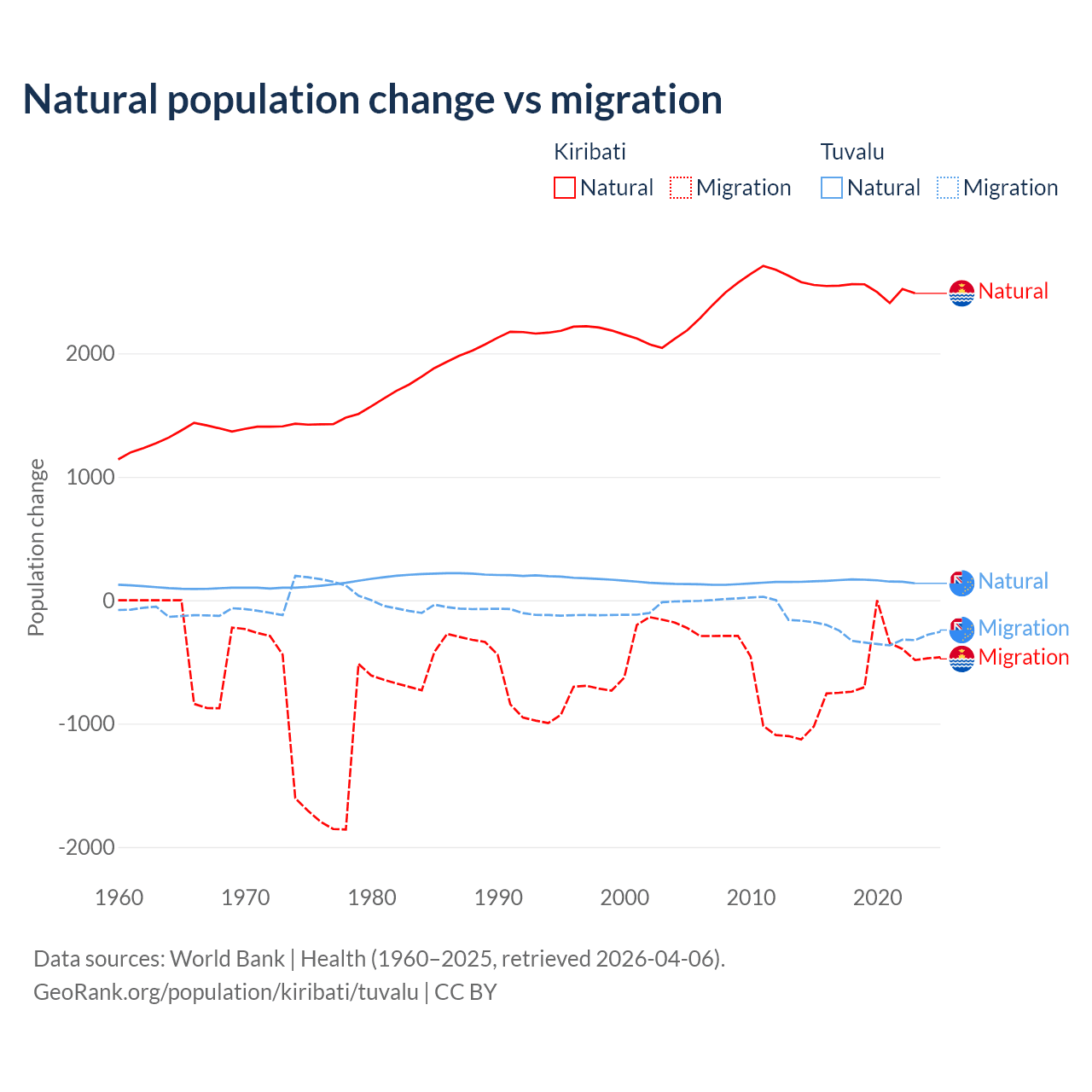 Over the last 10 years, 80% of the population change in Kiribati is from natural causes (a gain of 25,262 people) and 20% is from migration (a loss of 6,330 people). In Tuvalu 35.5% is from natural causes (a gain of 1,556 people) and 64.5% is from migration (a loss of 2,827 people).