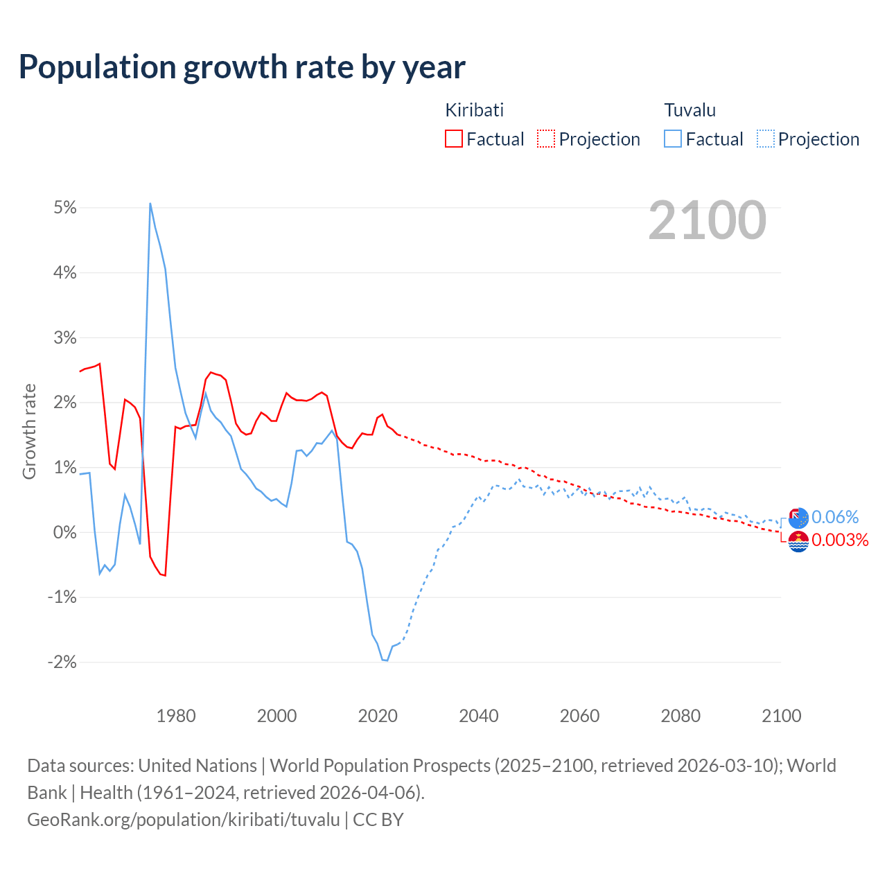 - For the last 10 years, Kiribati has had an average growth rate of +1.53% per year vs -1.19% in Tuvalu.