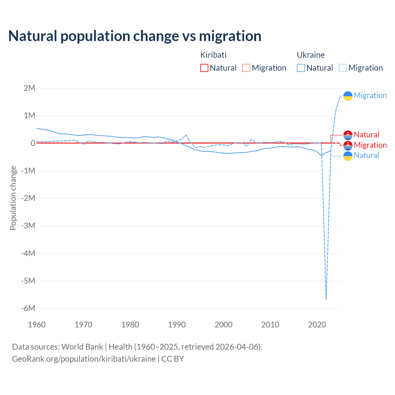 Over the last 10 years, 80% of the population change in Kiribati is from natural causes (a gain of 25,262 people) and 20% is from migration (a loss of 6,330 people). In Ukraine 28.2% is from natural causes (a loss of 2,435,153 people) and 71.8% is from migration (a loss of 6,198,995 people).