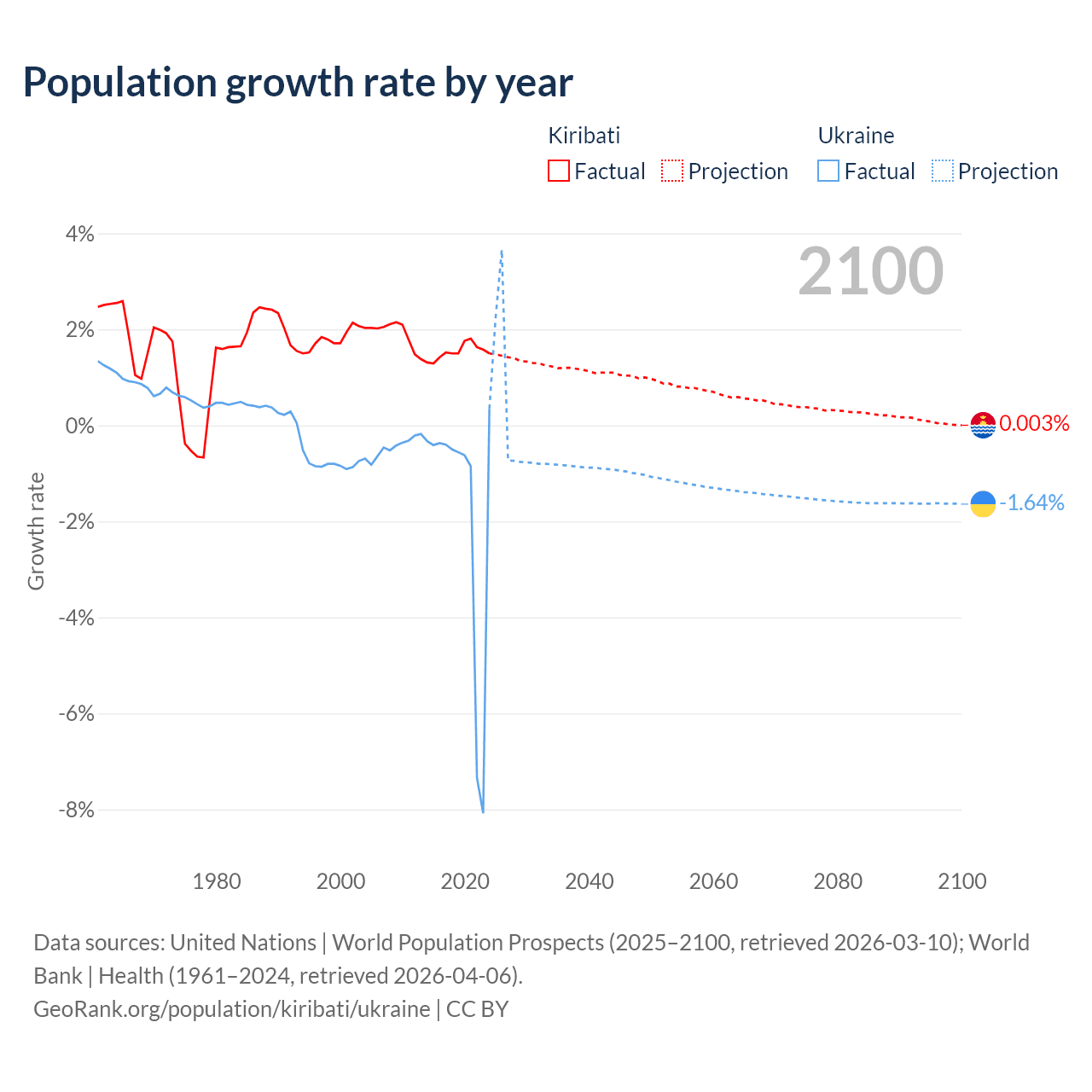 - For the last 10 years, Kiribati has had an average growth rate of +1.53% per year vs -1.74% in Ukraine.