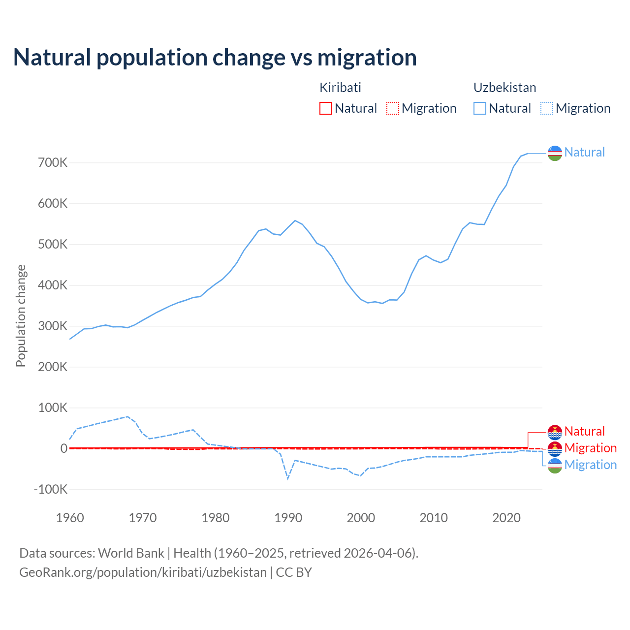 Over the last 10 years, 80% of the population change in Kiribati is from natural causes (a gain of 25,262 people) and 20% is from migration (a loss of 6,330 people). In Uzbekistan 98.2% is from natural causes (a gain of 6,161,117 people) and 1.84% is from migration (a loss of 115,398 people).