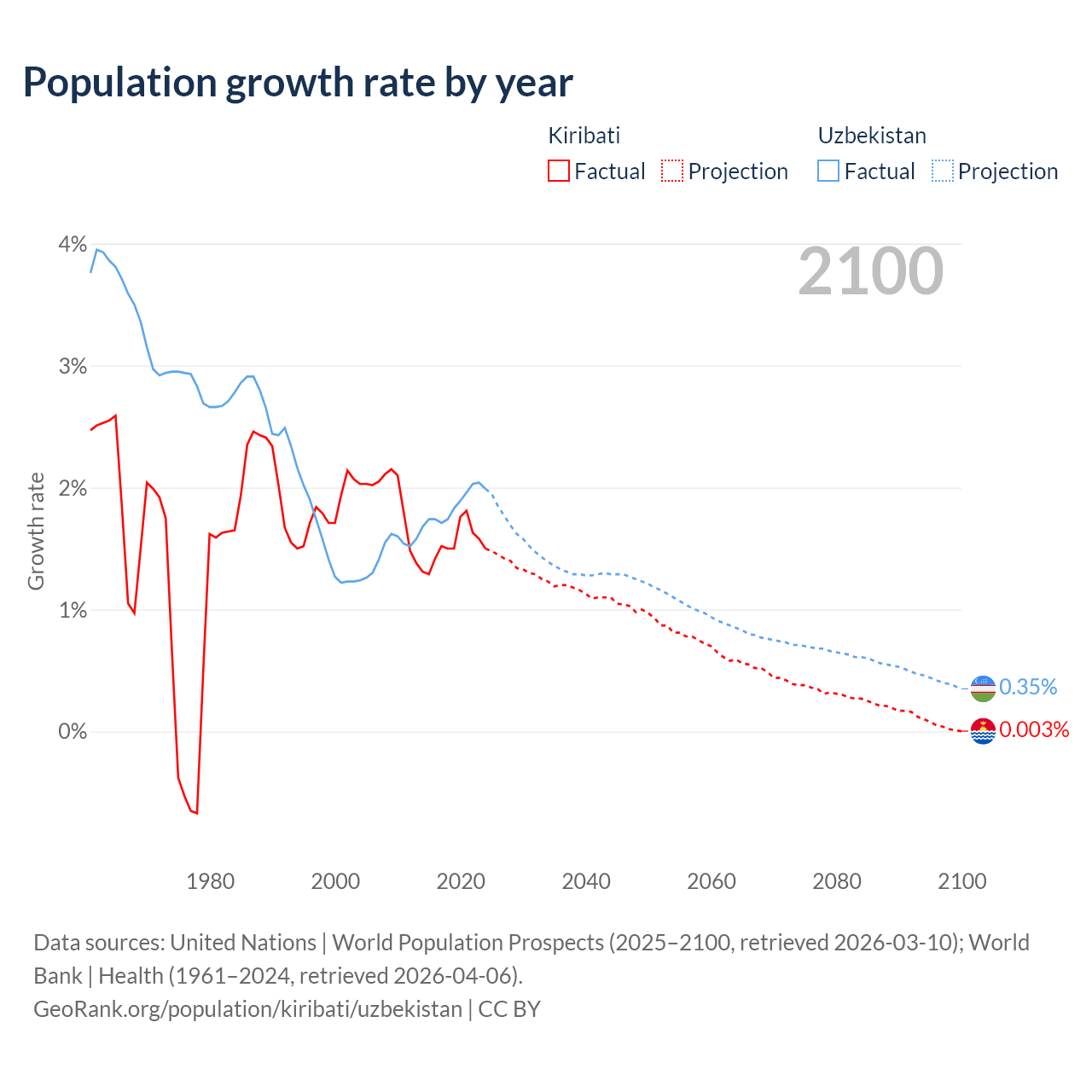 - For the last 10 years, Kiribati has had an average growth rate of +1.53% per year vs +1.85% in Uzbekistan.