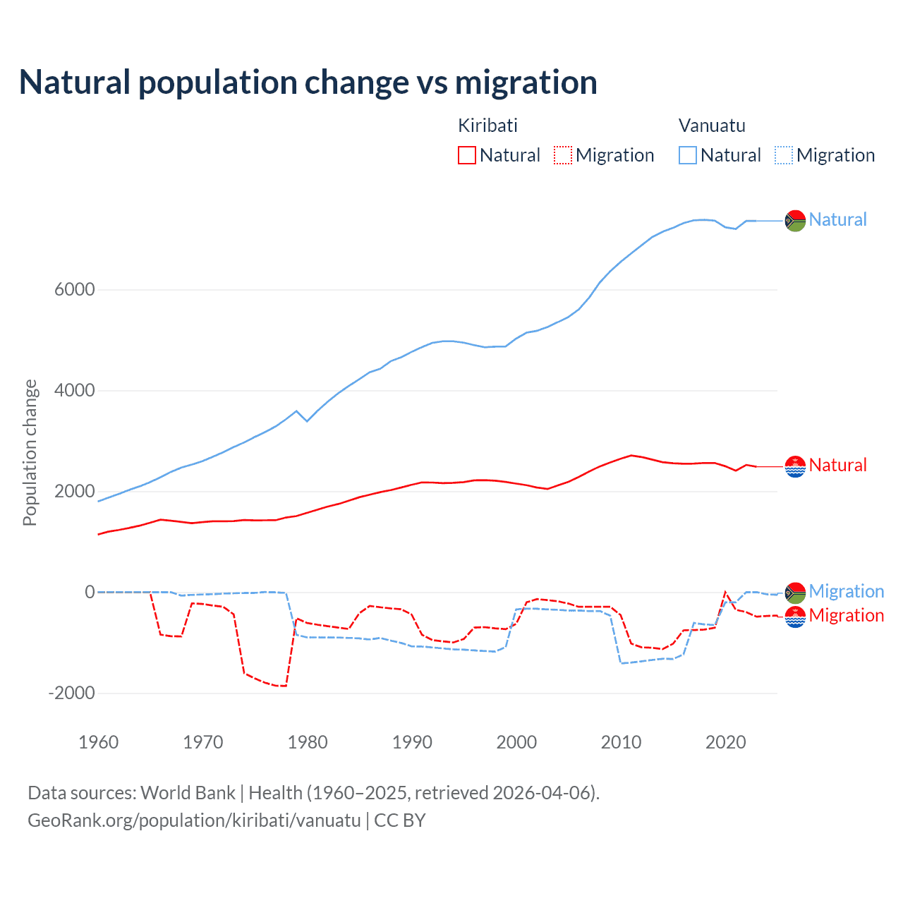 Over the last 10 years, 80% of the population change in Kiribati is from natural causes (a gain of 25,262 people) and 20% is from migration (a loss of 6,330 people). In Vanuatu 92.2% is from natural causes (a gain of 72,941 people) and 7.81% is from migration (a loss of 6,181 people).