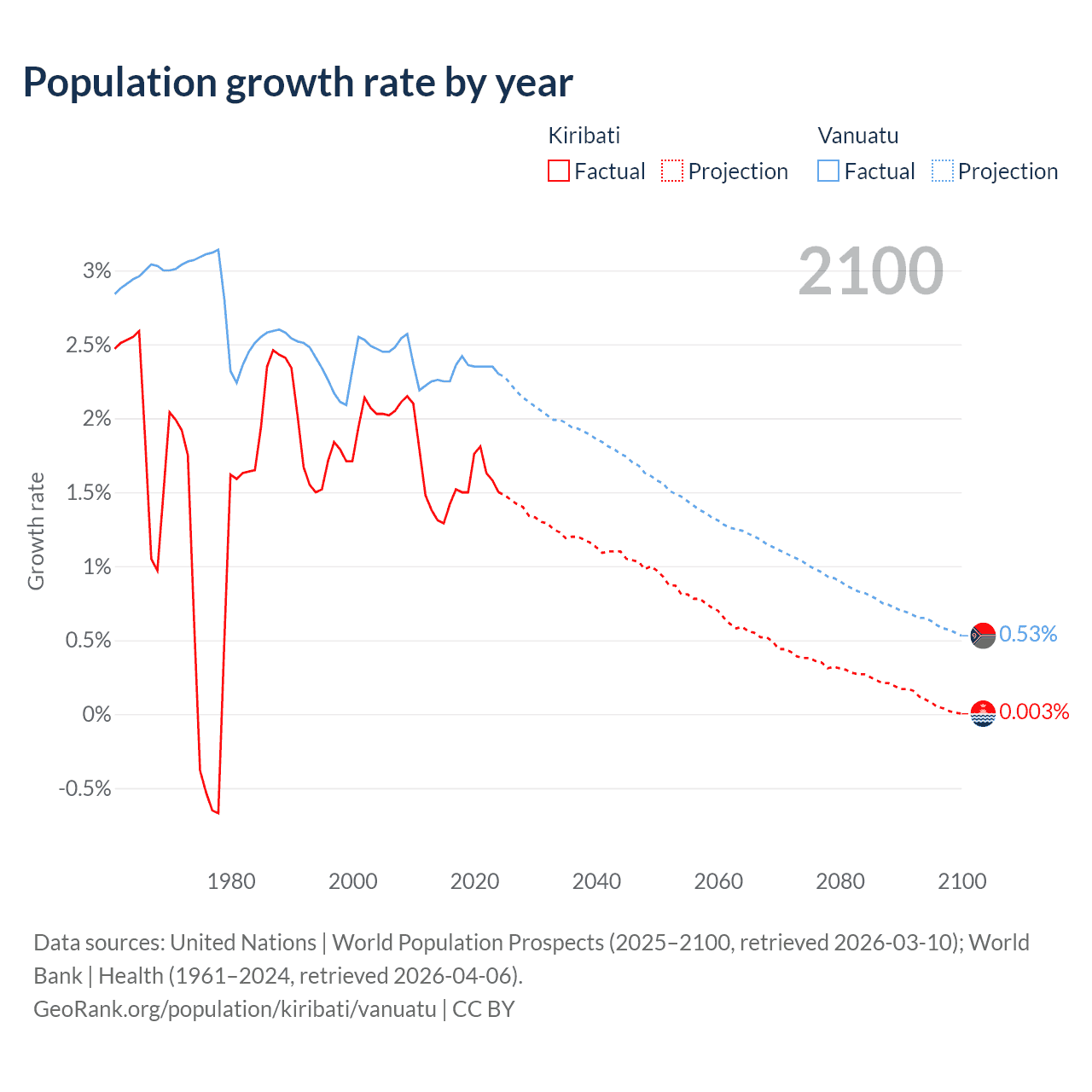 - For the last 10 years, Kiribati has had an average growth rate of +1.53% per year vs +2.33% in Vanuatu.