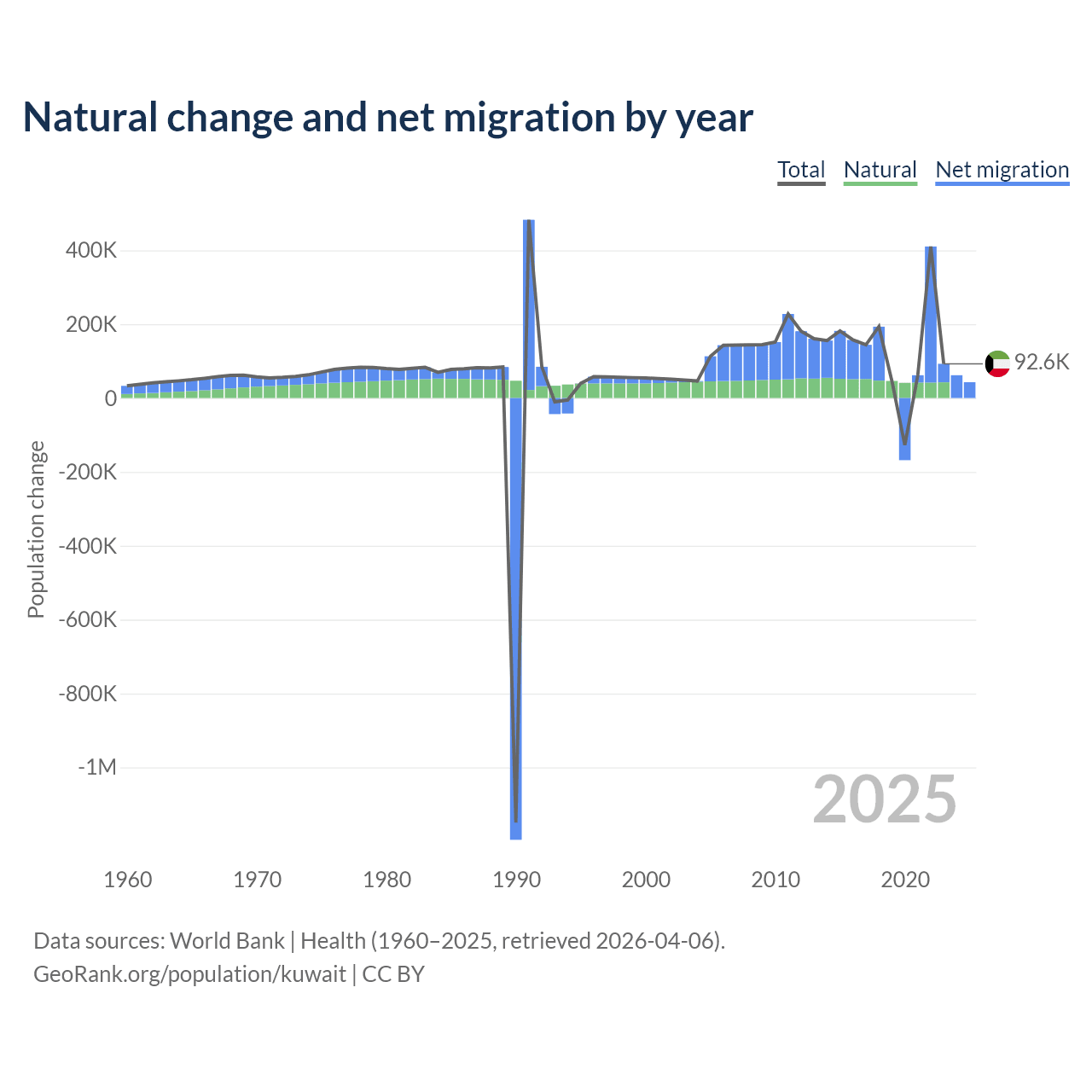 Over the last 10 years, 35.8% of the population change in Kuwait is from natural causes (a gain of 470,645 people) and 64.2% is from migration (a gain of 845,142 people).