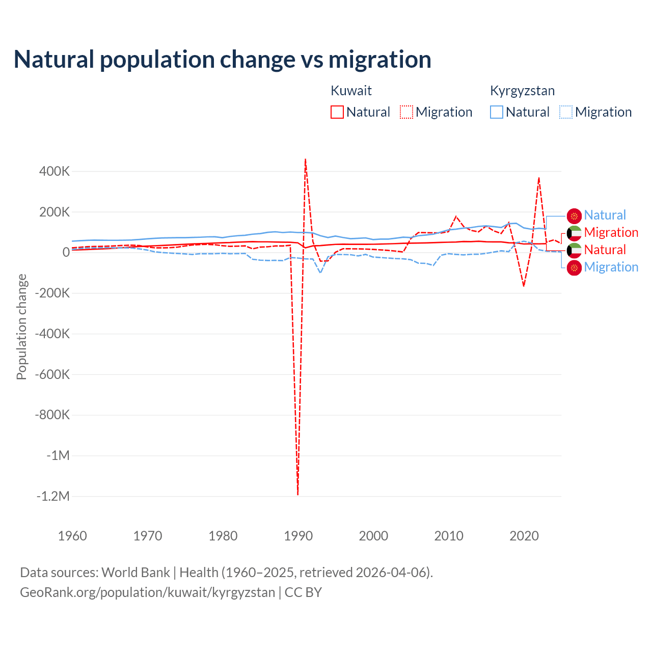 Over the last 10 years, 35.8% of the population change in Kuwait is from natural causes (a gain of 470,645 people) and 64.2% is from migration (a gain of 845,142 people). In Kyrgyzstan 88.5% is from natural causes (a gain of 1,258,837 people) and 11.5% is from migration (a gain of 164,132 people).