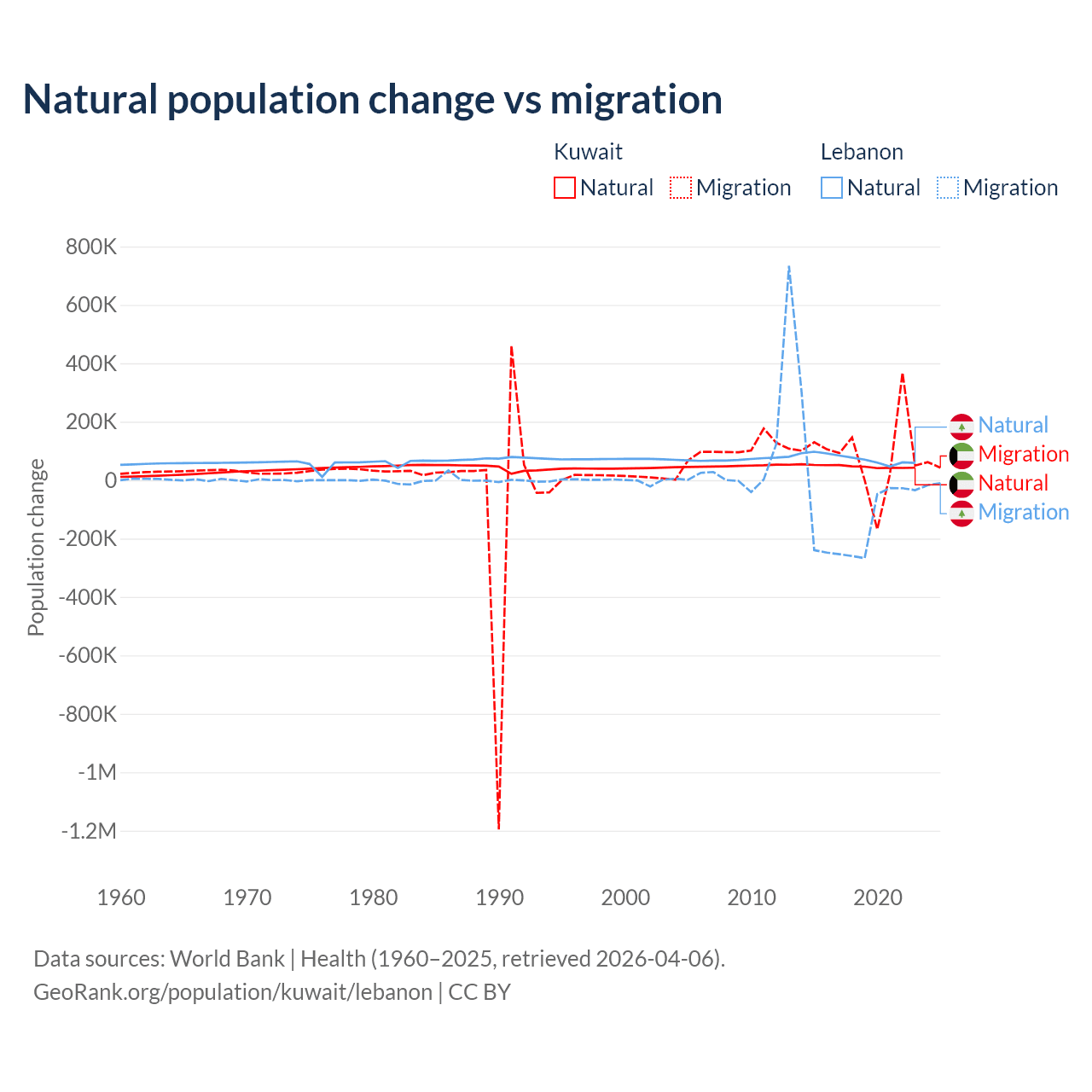 Over the last 10 years, 35.8% of the population change in Kuwait is from natural causes (a gain of 470,645 people) and 64.2% is from migration (a gain of 845,142 people). In Lebanon 40.1% is from natural causes (a gain of 739,256 people) and 59.9% is from migration (a loss of 1,103,772 people).