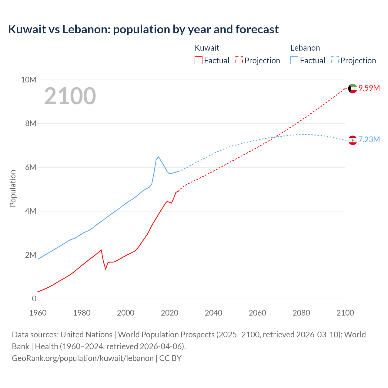 The latest officially reported population of Kuwait was 4,897,263 in 2024 vs 5,805,962 people in Lebanon in 2024. In 2026, based on the adjusted UN estimation, the current Kuwait's population is 5,100,145 people compared to 5,906,622 in Lebanon.