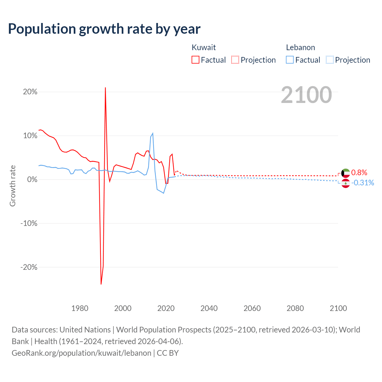 - For the last 10 years, Kuwait has had an average growth rate of +3.1% per year vs +0.16% in Lebanon.