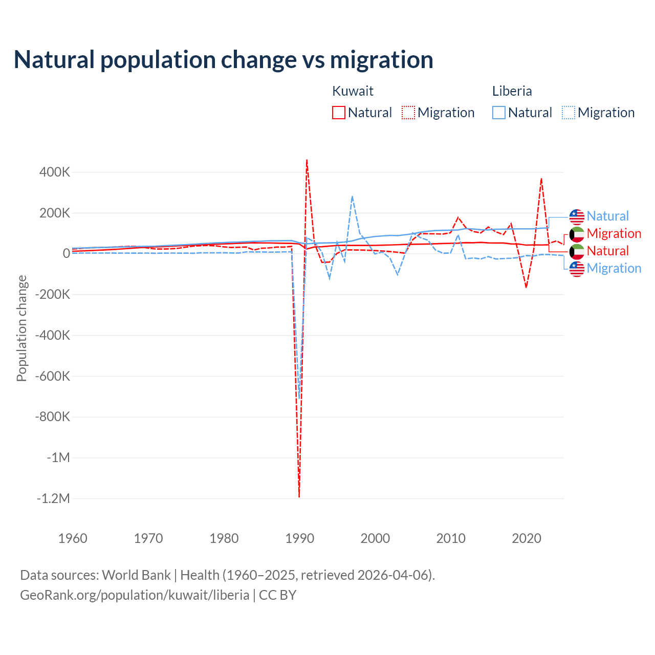 Over the last 10 years, 35.8% of the population change in Kuwait is from natural causes (a gain of 470,645 people) and 64.2% is from migration (a gain of 845,142 people). In Liberia 87.7% is from natural causes (a gain of 1,202,387 people) and 12.3% is from migration (a loss of 168,316 people).