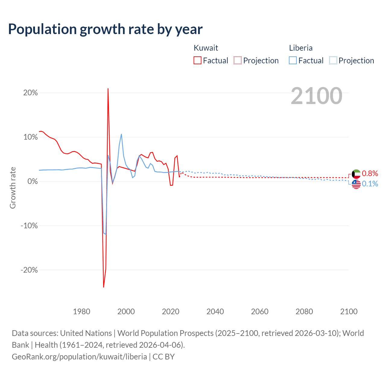 - For the last 10 years, Kuwait has had an average growth rate of +3.1% per year vs +2.09% in Liberia.