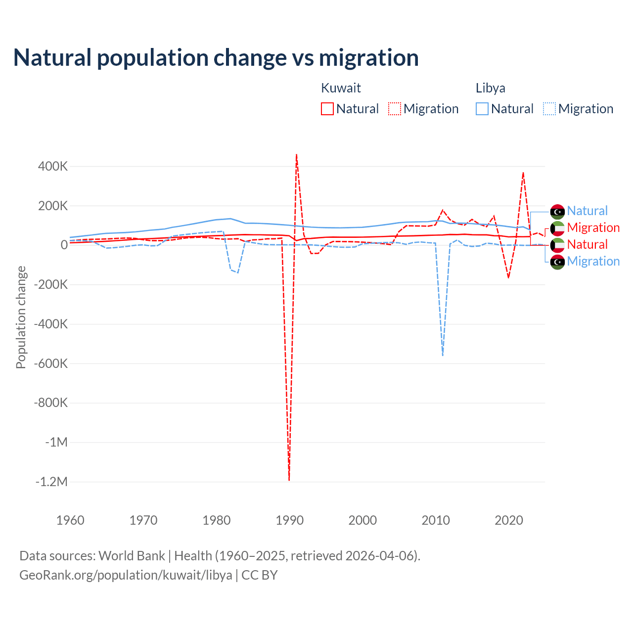 Over the last 10 years, 35.8% of the population change in Kuwait is from natural causes (a gain of 470,645 people) and 64.2% is from migration (a gain of 845,142 people). In Libya 99.4% is from natural causes (a gain of 975,799 people) and 0.63% is from migration (a loss of 6,150 people).