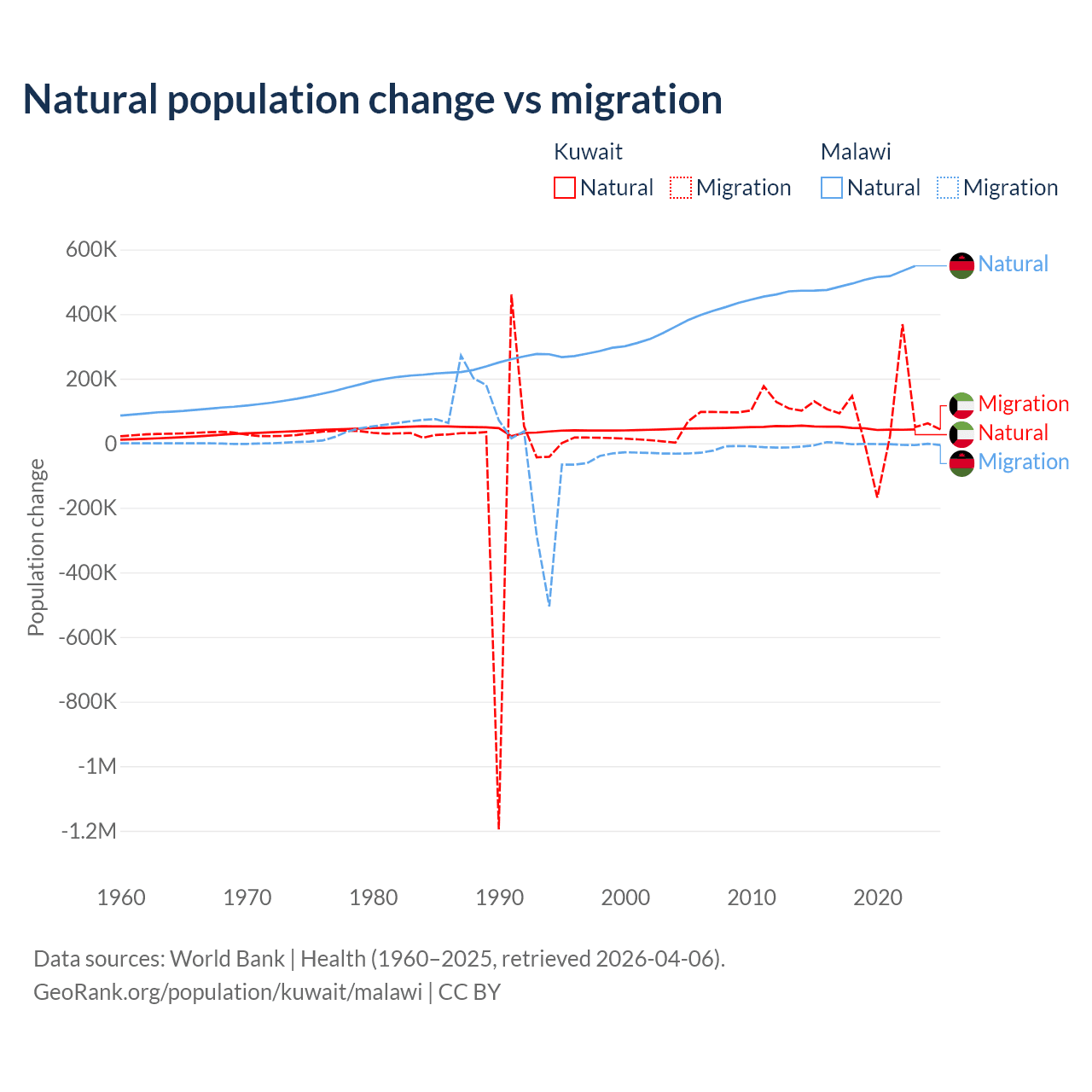 Over the last 10 years, 35.8% of the population change in Kuwait is from natural causes (a gain of 470,645 people) and 64.2% is from migration (a gain of 845,142 people). In Malawi 99.3% is from natural causes (a gain of 5,019,393 people) and 0.67% is from migration (a loss of 33,768 people).