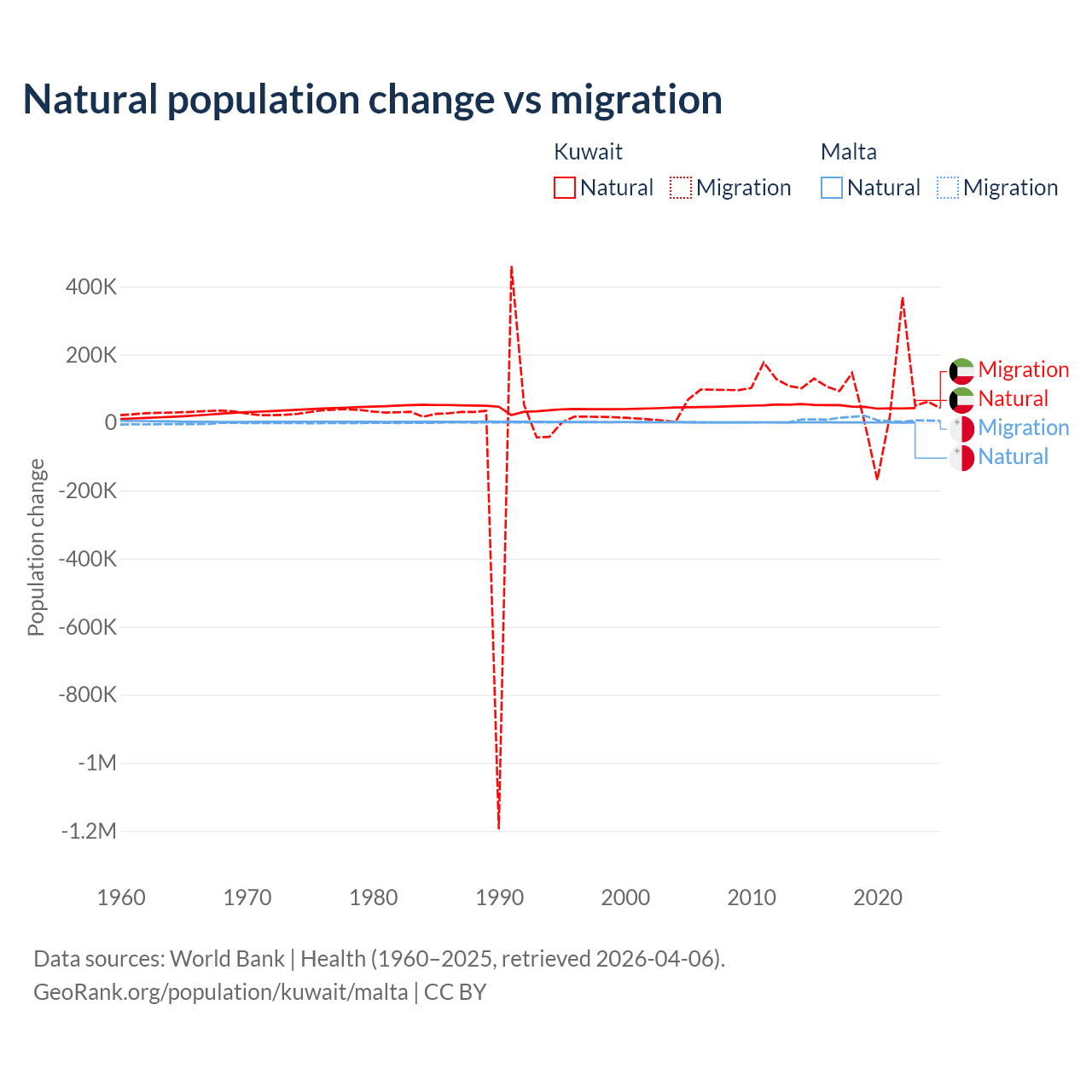 Over the last 10 years, 35.8% of the population change in Kuwait is from natural causes (a gain of 470,645 people) and 64.2% is from migration (a gain of 845,142 people). In Malta 5.84% is from natural causes (a gain of 6,181 people) and 94.2% is from migration (a gain of 99,652 people).