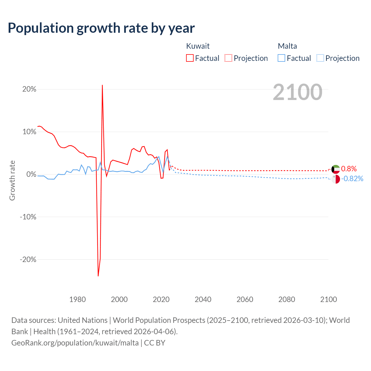 - For the last 10 years, Kuwait has had an average growth rate of +3.1% per year vs +2.69% in Malta.