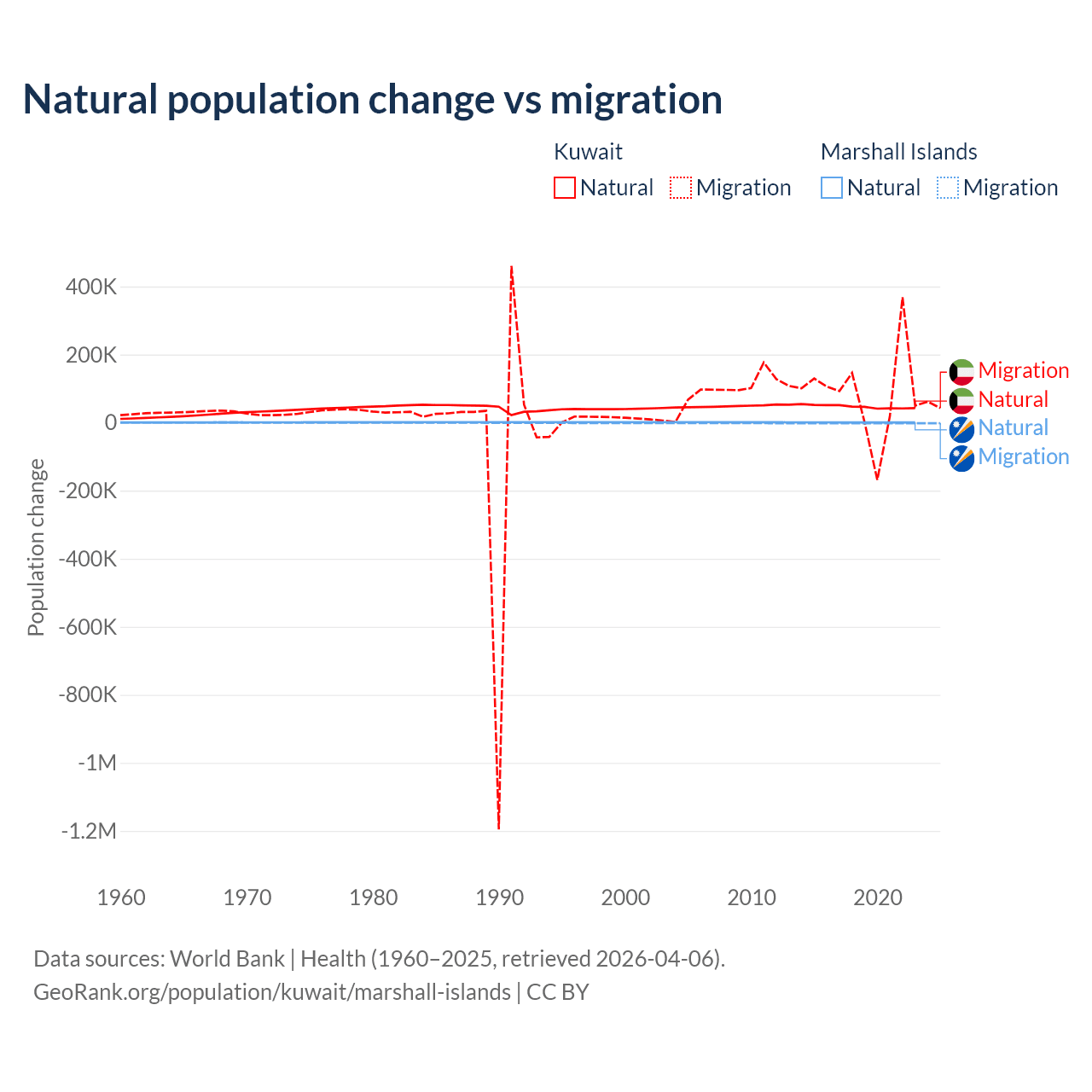 Over the last 10 years, 35.8% of the population change in Kuwait is from natural causes (a gain of 470,645 people) and 64.2% is from migration (a gain of 845,142 people). In the Marshall Islands 27.8% is from natural causes (a gain of 7,592 people) and 72.2% is from migration (a loss of 19,682 people).