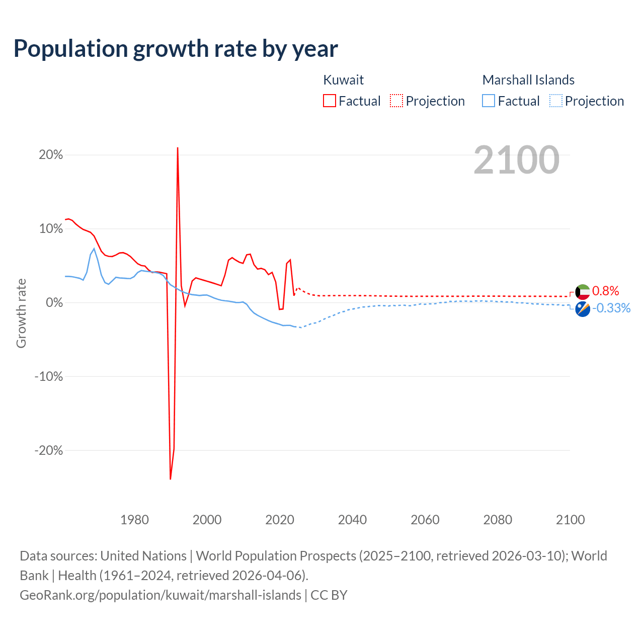 - For the last 10 years, Kuwait has had an average growth rate of +3.1% per year vs -2.69% in the Marshall Islands.