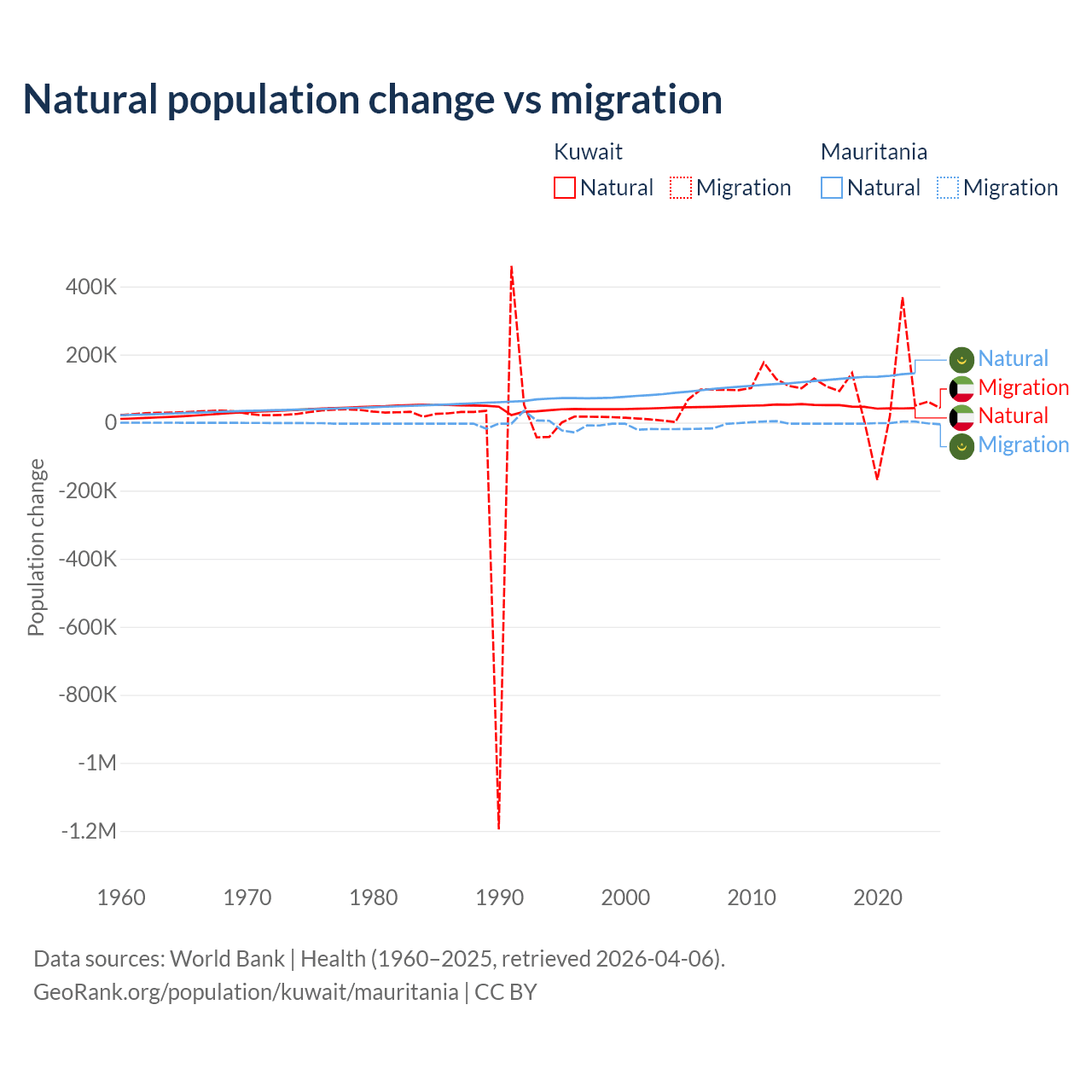 Over the last 10 years, 35.8% of the population change in Kuwait is from natural causes (a gain of 470,645 people) and 64.2% is from migration (a gain of 845,142 people). In Mauritania 98.9% is from natural causes (a gain of 1,320,903 people) and 1.12% is from migration (a loss of 14,982 people).